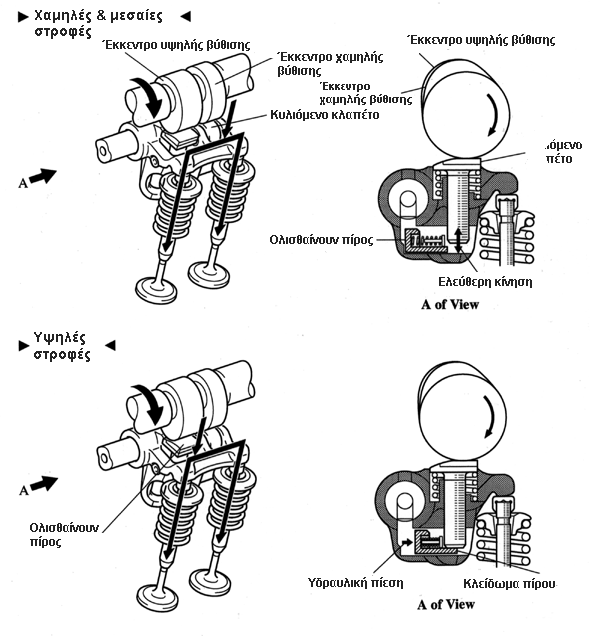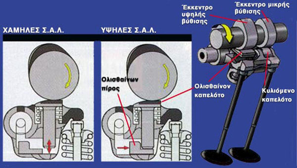 Στις “χαμηλές” στροφές λειτουργίας (μέχρι τις 6.000 σ.α.λ.) το μικρό και αργό έκκεντρο κινεί το καπελότο που ενεργοποιεί τις βαλβίδες, ενώ το μεγάλο έκκεντρο περιστρέφεται ελεύθερα χωρίς να επηρεάζει την κίνησή τους.Πάνω από τις 6.000σ.α.λ. -και μέχρι τις 8.200σ.α.λ.- ένας αισθητήρας τοποθετημένος στον εκκεντροφόρο δίνει εντολή στην ηλεκτρονική μονάδα να αυξήσει την υδραυλική πίεση, ωθώντας ένα ωστήριο να “κλειδώσει” το καπελότο που κινεί τις βαλβίδες με το μεγάλο έκκεντρο. Η διαδρομή βύθισης αυξάνεται, επιτρέποντας την εισαγωγή αυξημένου σε όγκο μείγματος και παράλληλα την εξαγωγή μεγαλύτερου όγκου καυσαερίων.
