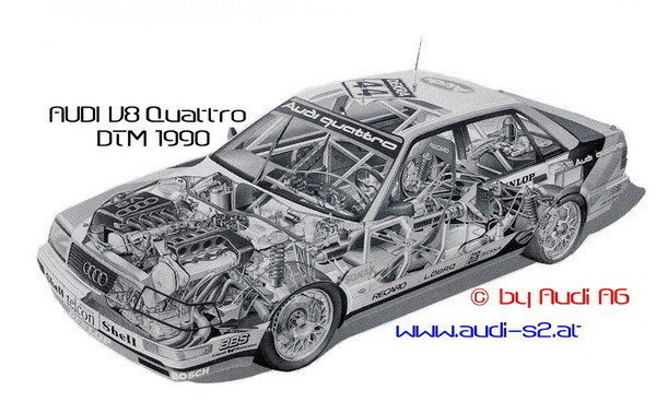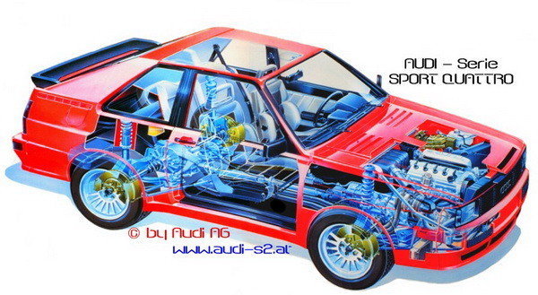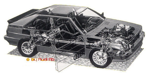 Η βάση για την εξέλιξη του συστήματος τετρακίνησης ήταν ένα κόκκινο Audi 80 Coupe εξοπλισμένο με πεντακύλινδρο turbo κινητήρα ισχύος 160 ίππων και ελαφρώς αυξημένο μεταξόνιο. O κινητήρας είχε παραμείνει στην διαμήκη θέση του, όπως και το κιβώτιο ταχυτήτων, ενώ την εξέλιξη της μονάδας μετάδοσης στους πίσω τροχούς είχε αναλάβει ο H.Nedvidek. O άνθρωπος που κατασκεύαζε κιβώτια ταχυτήτων στα Grand Prix, με τα μονοθέσια που συμμετείχαν -μεταξύ άλλων- οι S.Moss και M.Fangio, είχε τοποθετήσει έναν άξονα που γεφύρωνε απευθείας την έξοδο του κιβωτίου ταχυτήτων με τους πίσω τροχούς. Δεν υπήρχε κεντρικό διαφορικό καθώς το σύστημα τετρακίνησης προέρχονταν από τα Iltis, τα τζιπ που προορίζονταν για τον γερμανικό στρατό, και η εμπλοκή της κίνησης σε όλους τους τροχούς ήταν εφικτή μόνο χειροκίνητα.
