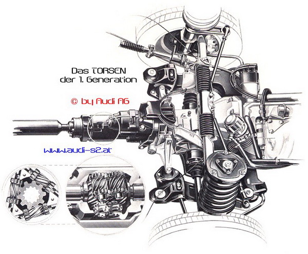 Σχεδιαστική απεικόνιση με το σύστημα τετρακίνησης του Audi Quattro του ’82. Το κεντρικό διαφορικό Torsen είχε τοποθετηθεί μερικά εκατοστά πίσω από τον κατά μήκος τοποθετημένο κινητήρα των 200 ίππων και αναλάμβανε την ομαλή κατανομή της ροπής ανάμεσα στους δύο άξονες. Αξίζει να σημειωθεί πως στην κεντρική κονσόλα του αυτοκινήτου υπήρχε διακόπτης που -κατ’ επιλογήν- μπλοκάριζε το κεντρικό με το πίσω διαφορικό.
