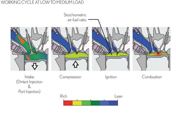 Κατά την «κρύα εκκίνηση» ο ψεκασμός στην φάση της εισαγωγής γίνεται με τον συμβατικό τρόπο ενώ κατά τη φάση της συμπίεσης επισπεύδεται και ο άμεσος ψεκάζοντας μια μικρή ποσότητα καυσίμου στην περιοχή γύρω από τα μπουζί. Με αυτόν τον τρόπο επιτυγχάνεται ένα πλουσιότερο μίγμα (αναλογίας 15-16:1) την ώρα που οι καταλύτες ανεβάζουν την θερμοκρασία τους ώστε να μειώσουν τους ρύπους. Όταν ο κινητήρας λειτουργεί στο ρελαντί γίνεται χρήση μόνο του άμεσου ψεκασμού ενώ σε συνθήκες χαμηλού ή μέτριου φορτίου συνδυάζεται και ο συμβατικός ώστε το μίγμα να είναι ομοιογενές (με αναλογία 12-15:1). Σε συνθήκες υψηλού φορτίου το καύσιμο ψεκάζεται κατευθείαν στους θαλάμους καύσης για μεγαλύτερη ακρίβεια, μικρότερη θερμοκρασία ανάφλεξης και τελειότερη καύση του μίγματος μειώνοντας τις εκπομπές ρύπων. Εκτός από τον ψεκασμό σημειώστε πως τις 24 βαλβίδες του V6 συντονίζει το «διπλό» VVT-i με εύρος από 60 έως 35 μοίρες.