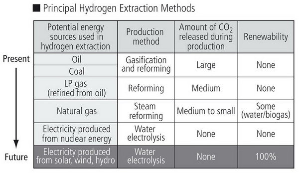 H Honda υποστήριζε πως ένας από τους καλύτερους τρόπους για να παραχθεί υδρογόνο είναι από την διάσπαση του φυσικού αερίου. Ο βαθμός απόδοσης ανέρχεται στο 60% (σε σχέση με το 80% από την διύλιση της βενζίνης) αλλά εδώ σημειώστε πως οι ηλεκτροκινητήρες έχουν μικρότερες ενεργειακές απαιτήσεις και απώλειες σε σχέση με τις μηχανές εσωτερικής καύσης. Επειδή όμως το φυσικό αέριο κάποια στιγμή θα εξαντληθεί τελευταία οι Ιάπωνες άλλαξαν άποψη και μιλούν πλέον για ηλιακούς σταθμούς παραγωγής υδρογόνου μέσω ηλεκτρόλυσης με βαθμό απόδοσης 53%-66%. Ωραίος ο αντιπερισπασμός με τις ανανεώσιμες μορφές ενέργειας αλλά το πρόβλημα της διακοπτόμενης ροής εξακολουθεί να υφίσταται…