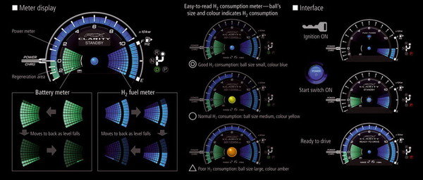 Τα όργανα του οχήματος συνεργάζονται, παρέχοντας τα δεδομένα που χρειάζεται ο οδηγός ως μια αποτελεσματική διεπαφή. Ο σφαιρικός δείκτης κατανάλωσης H2 αλλάζει χρώμα και μέγεθος, για να δηλώσει την κατανάλωση του υδρογόνου καθώς αλλάζουν οι οδηγικές συνθήκες. Κατά τη διάρκεια της υψηλής κατανάλωσης, η σφαίρα μεγαλώνει και γίνεται πορτοκαλί. Καθώς η κατανάλωση μειώνεται, συρρικνώνεται και γίνεται κίτρινη, και, στη συνέχεια, μπλε.