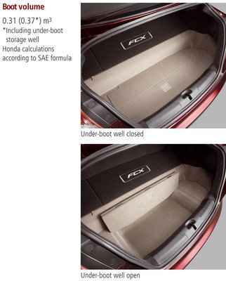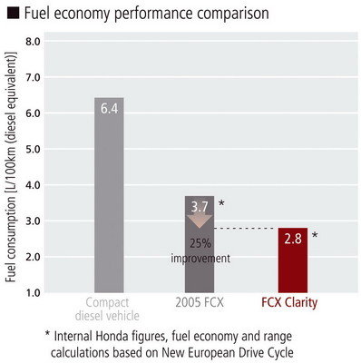 Όταν ρέει το καύσιμο ακούγεται ένας θόρυβος ο οποίος σταματά όταν γεμίσει το ντεπόζιτο. Όταν οι δεξαμενές γεμίσουν η πίεση φτάνει τα 350 bar. Συμπιεσμένο και υγροποιημένο στις δεξαμενές το υδρογόνο δεν ξεπερνά σε βάρος τα 4,1 κιλά και προσφέρει αυτονομία 460 χλμ. Μία τυπική εταιρία παραγωγής υδρογόνου στη Γερμανία πουλά το κιλό το υδρογόνο περίπου στα 8,88 ευρώ. Οπότε για να γεμίσει το ρεζερβουάρ χρειάζονται 36 ευρώ ενώ η θεωρητική ισοδυναμία που δίνει η Honda είναι 2,8 λίτρα diesel ανά 100 χλμ.