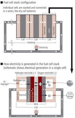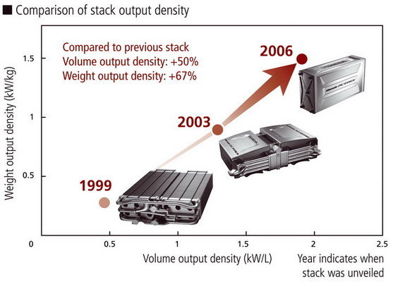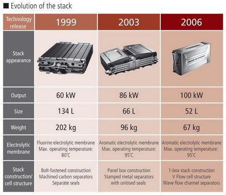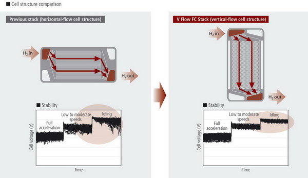 - Κυματοειδή κανάλια ροής για ελαφρύτερη, πιο συμπαγή συστοιχία με πολύ μεγαλύτερη ικανότητα παραγωγής ηλεκτρικής ενέργειας. Η νέα συστοιχία χρειάζεται μόνο ένα στρώμα ψύξης ανά δύο κυψέλες. Έτσι επιτυγχάνεται μείωση 20% στο μήκος της συστοιχίας και μείωση του βάρους κατά 30%.