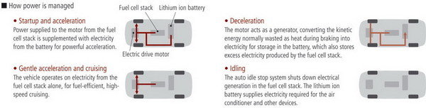 - Ο τωρινός ηλεκτροκινητήρας αποδίδει 100 kW. Το όριο στροφών του είναι 12.500 σ.α.λ. Οι κυψέλες είναι τύπου ανταλλαγής πρωτονίων. Ο καταλύτης είναι πλατίνα. Υπάρχουν περίπου 500 στοιχεία στις κυψέλες καυσίμου. Οι μπαταρίες λιθίου-ιόντων είναι 288 V.
