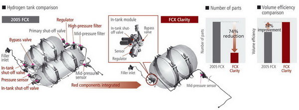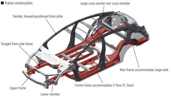 - Έγινε προσπάθεια για να μειωθεί όσο το δυνατόν το βάρος του οχήματος με τη μείωση σε επιμέρους σημεία, πλαίσιο, κυψέλες καυσίμου, ηλεκτροκινητήρας. Επίσης, με την τεχνική του «V Stack» μειώθηκαν οι διαστάσεις των κυψελών. Το βάρος των κυψελών καυσίμου είναι 67 κιλά. Συγκριτικά, το 1999 το βάρος των τότε κυψελών καυσίμου ήταν 202 κιλά και ο ηλεκτροκινητήρας απέδιδε ισχύ 60 kW.