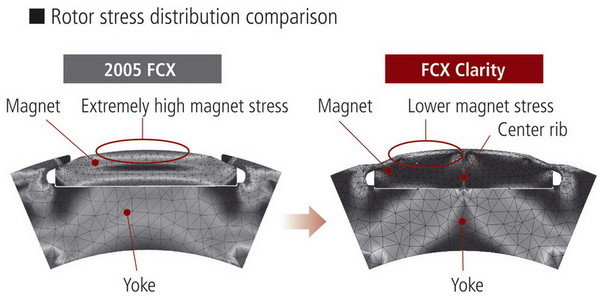 - Ένας ρότορας νέας σχεδίασης διαθέτει έναν εσωτερικό μόνιμο μαγνήτη (Interior Permanent Magnet , IPM) για να μειώνει την επαγωγική αντίσταση, βελτιώνοντας τη ροπή αδρανείας για παραγωγή υψηλής ροπής.