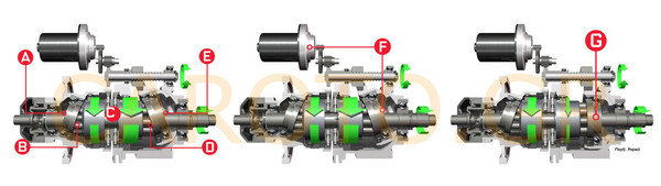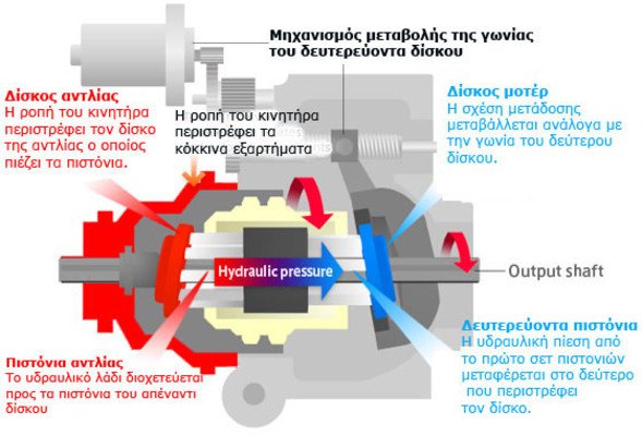 - (Ε) Το δεύτερο σετ πιστονιών πιέζει το δεύτερο μεταλλικό δίσκο που περιστρέφεται και μεταδίδει την ροπή στον άξονα εξόδου.