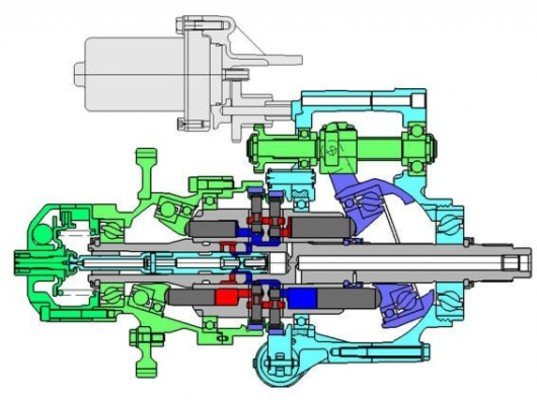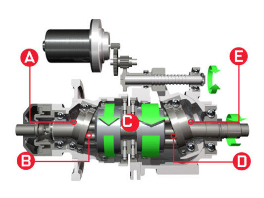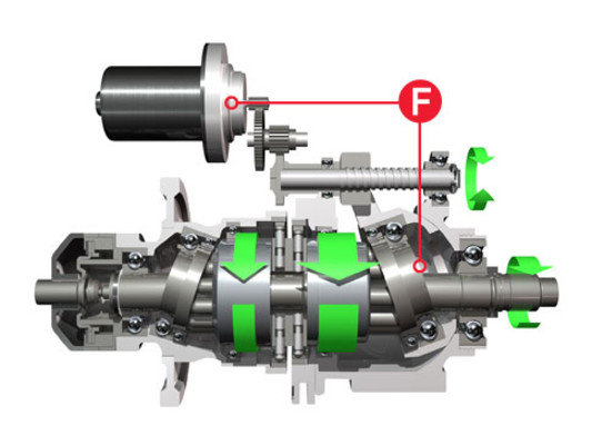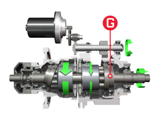 - (F) Ένας ηλεκτροκινητήρας ρυθμίζει την γωνία του δεύτερου δίσκου μεταβάλλοντας την σχέση μετάδοσης. Μεγάλη γωνία σημαίνει αυξημένη ροπή και χαμηλή γωνιακή ταχύτητα (χαμηλές ταχύτητες). Μικρή γωνία σημαίνει λιγότερη ροπή αλλά μεγαλύτερη γωνιακή ταχύτητα (υψηλές ταχύτητες).