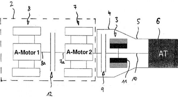 • Έτσι, η BMW αναζητά ένα πιο κόμπακτ και με μικρότερο κόστος σύστημα το οποίο θα μπορούσε να είναι αυτό που βλέπετε στην εικόνα (εδώ ολόκληρη η πατέντα). Στη πατέντα γίνεται αναφορά για δύο δικύλινδρους βενζινοκινητήρες (split engine) που θα μπορούσαν να συνθέτουν μία μονάδα που θα συνεργάζεται με τον ηλεκτροκινητήρα. Επίσης, γίνεται υπόθεση πως ο ένας κινητήρας θα υποστηρίζει και θα υποβοηθά τον άλλο ενώ ο καθένας θα μπορεί να έχει διαφορετικό μέγεθος.