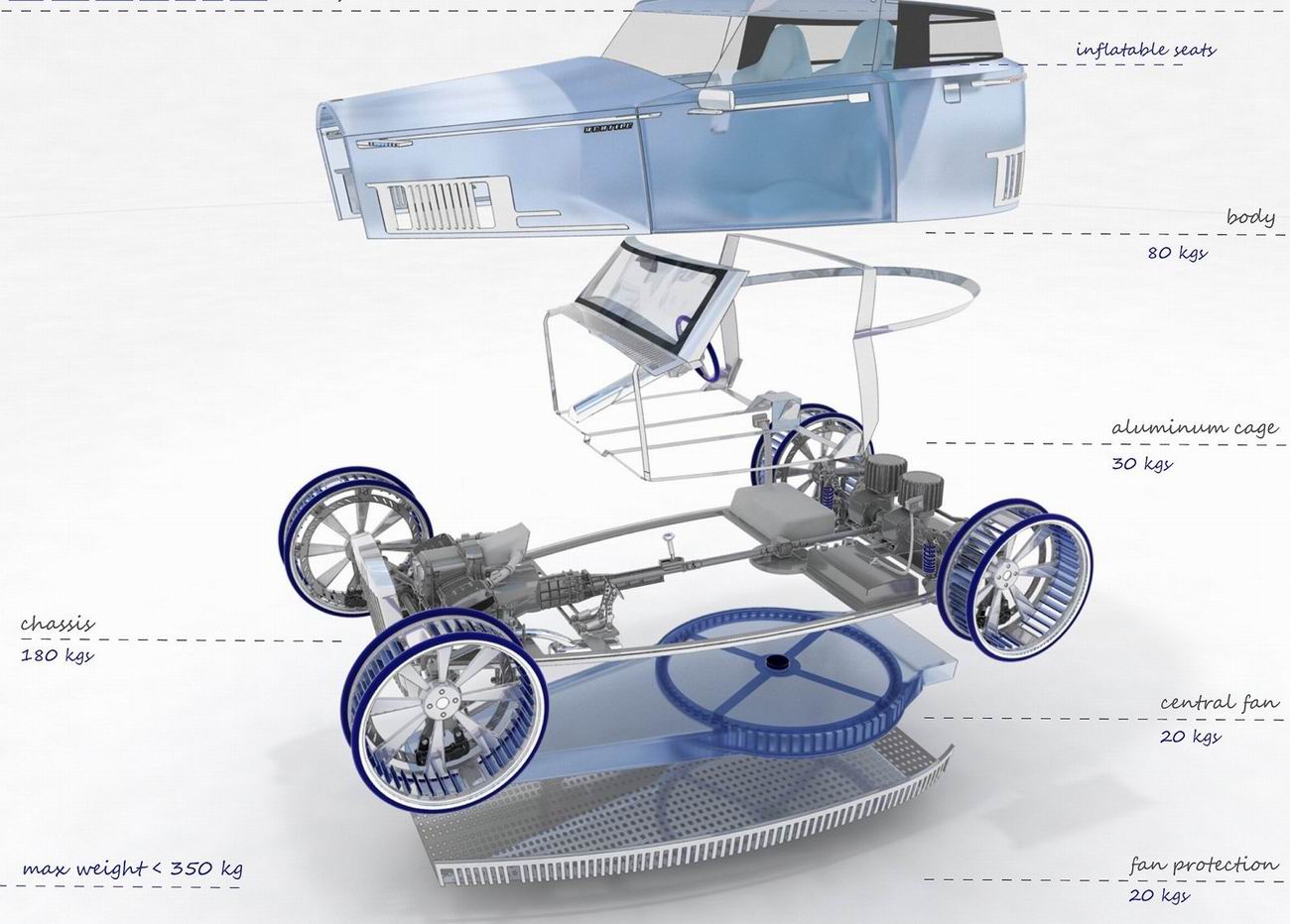 • Στο κάτω μέρος του Ventile υπάρχει ένα μεγάλο τύμπανο με κεκλιμένα πτερύγια που λειτουργεί σαν “ανεμόμυλος” -απορία: θα μπορούσε δημιουργώντας υποπίεση να αυξήσει την αρνητική άντωση και να βελτιώσει το κράτημα του αυτοκινήτου- ενώ προσέξτε πως ακόμη και οι τροχοί έχουν παρόμοια σχεδίαση (σ.σ. προφανώς οι στεφάνες είναι σταθερές, τα τύμπανα περιστρέφονται ανεξάρτητα.