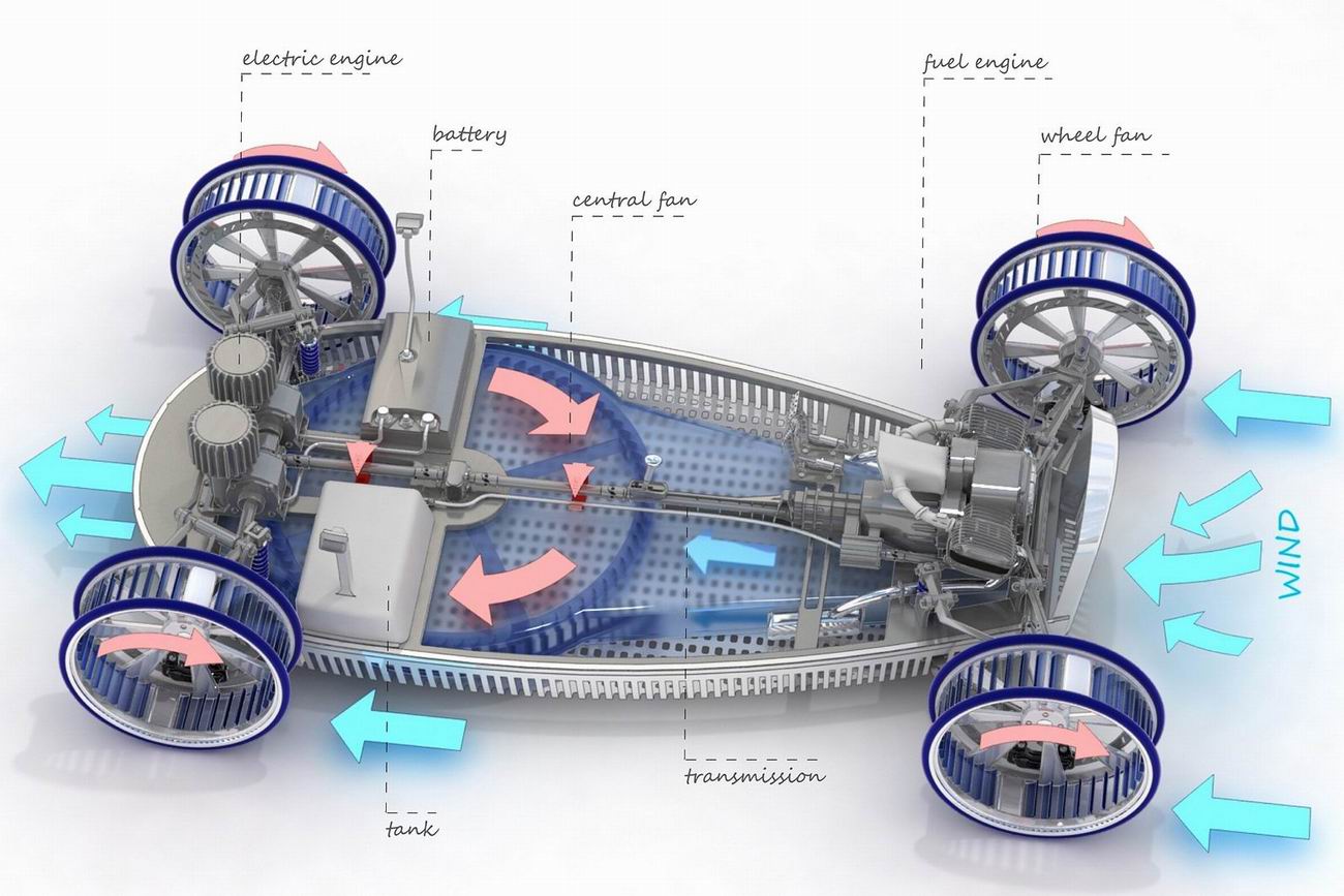 • resize-of-ventile-concept-hybrid-study-5Γιατί ένα υβριδικό να συνδυάζει δύο πηγές ενέργειας -την μηχανική από τον ΜΕΚ και την ηλεκτρική από τις μπαταρίες- και όχι μια ακόμη που ούτως ή άλλως εν κινήσει πηγαίνει στράφι; Κάτι τέτοιο οραματίστηκε ο Thierry Dumaine στο πλαίσιο ενός διαγωνισμού της Michelin και σχεδίασε την πρωτότυπη πλατφόρμα που βλέπετε. Βέβαια, η ιδέα του 51χρονού Γάλλου από τη Νίκαια δεν βασίζεται στην αρχή που θέλει τα υβριδικά να ανακτούν ενέργεια κατά την επιβράδυνση αλλά κατά την επιτάχυνση!