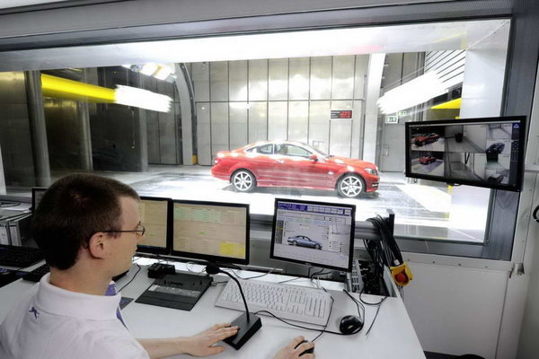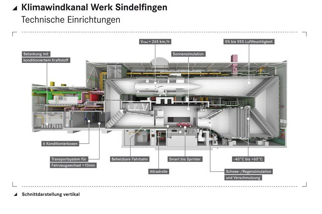 • Μία τεράστια τουρμπίνα δημιουργεί ροή ανέμου που μπορεί να φτάσει τα 265 km/h ενώ ένα δυναμόμετρο με επιτάχυνση 20 m/s2 υπολογίζει την πέδηση και στους δύο άξονες (για χρήση και σε τετρακίνητα μοντέλα πέρα από τα προσθιοκίνητα και πισωκίνητα). Στην περίπτωση που ένα μοντέλο δοκιμάζεται με κίνηση από τον κινητήρα του τότε η κινητική ενέργεια από το δυναμόμετρο μετατρέπεται σε ηλεκτρική και διοχετεύεται στο δίκτυο των εγκαταστάσεων. “Τέτοιου είδους προσομοιωτές μας βοηθούν να διαπιστώσουμε την αξιόπιστη λειτουργία των αυτοκινήτων μας σε διάφορα μέρη του κόσμου. Για παράδειγμα ανάλογες πολικές θερμοκρασίες μπορούν να επικρατήσουν στα βόρεια της Σουηδίας ενώ ιδιαίτερα θερμές στην Death Valley των ΗΠΑ” λέει ο Dr Thomas Weber, ειδικός στο τμήμα έρευνας και εξέλιξης της Daimler AG .