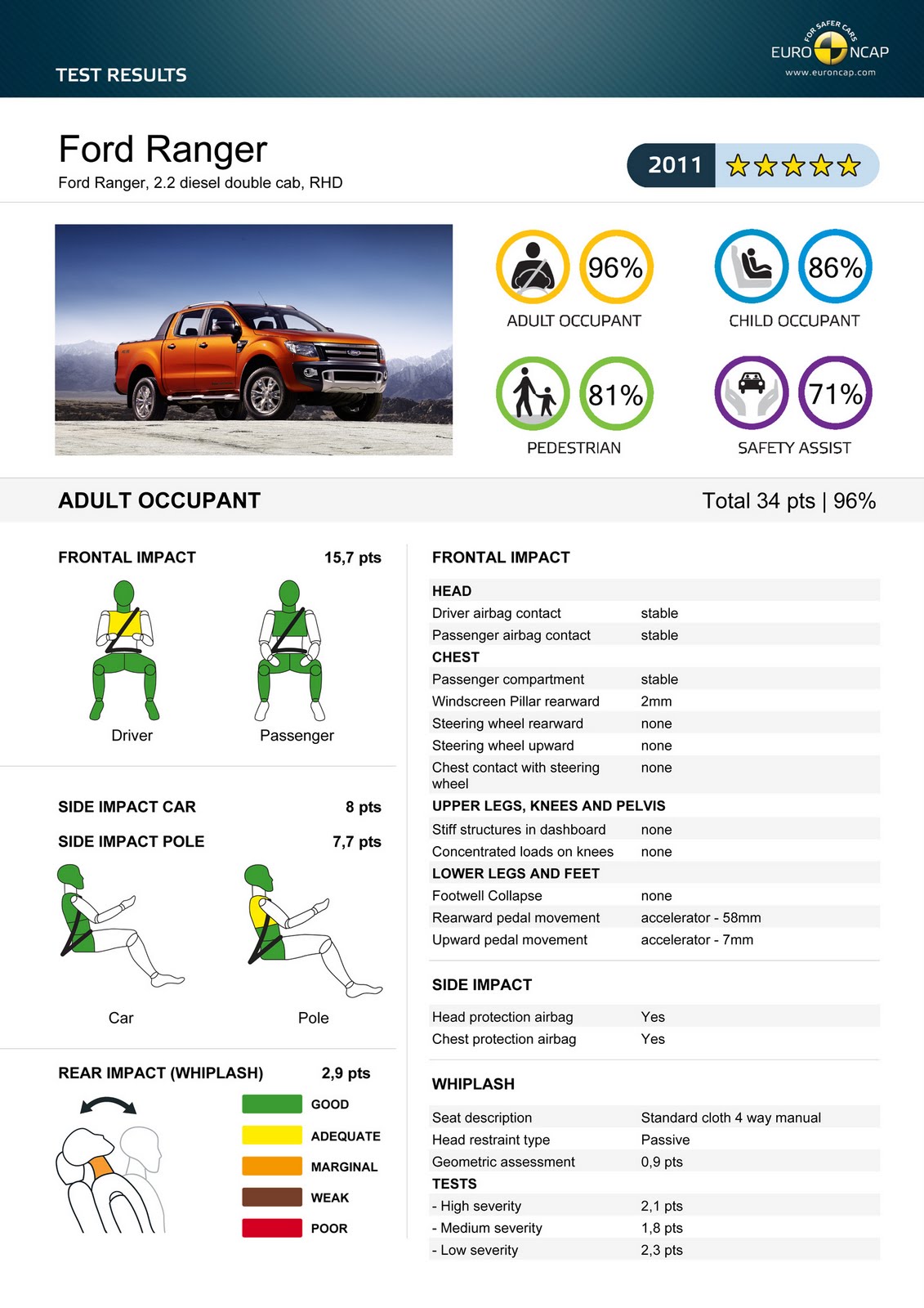 Euro NCAP είναι το όνομα του μεγαλύτερου και πιο έγκυρου ανεξάρτητου οργανισμού στην Ευρώπη στον τομέα των crash tests. Ιδρύθηκε το 1997 και υποστηρίζεται από κυβερνήσεις, λέσχες αυτοκινήτου, συνδέσμους καταναλωτών και ασφαλιστικές εταιρίες. Οι υπεύθυνοι αξιολόγησης περιέγραψαν τα αποτελέσματα δοκιμών του Ranger ως ‘αξιοσημείωτα’ με ‘εντυπωσιακά’ σκορ σε όλες τις κατηγορίες.
