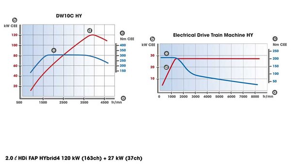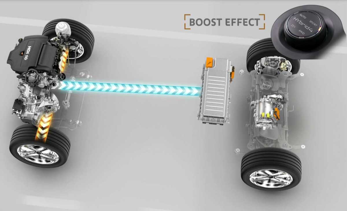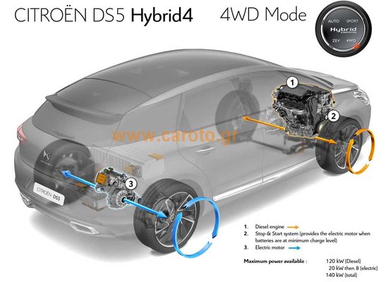 - 4WD: για μέγιστη πρόσφυση δημιουργείται μία τεχνητή τετρακίνηση όπου οι μπροστινοί τροχοί κινούνται από τον πετρελαιοκινητήρα και οι πίσω από τον ηλεκτροκινητήρα. Εδώ η μέγιστη ισχύς φτάνει τους 190 PS.