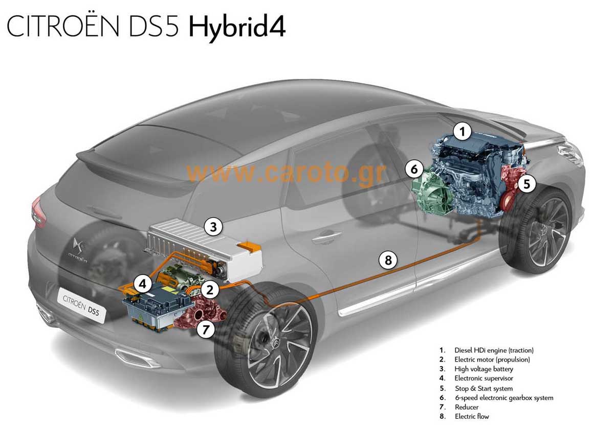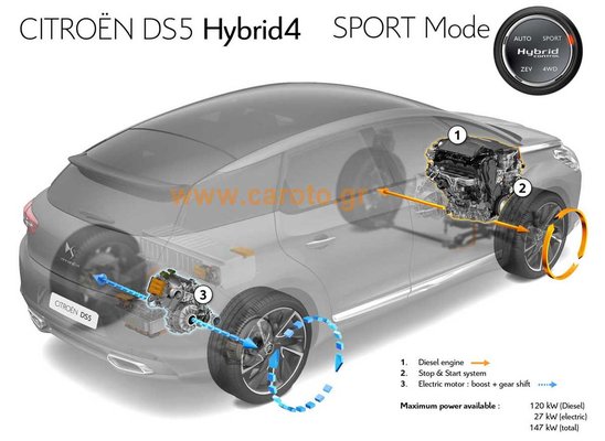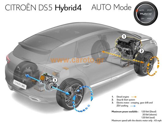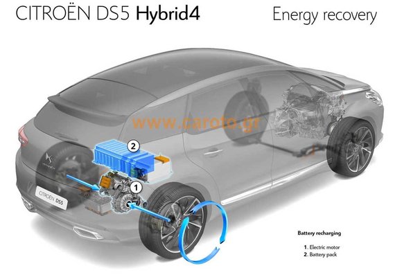 Εν τάχει να υπενθυμίσω πως στην περίπτωση του Citroen DS5 το σύστημα Hybrid4 απαρτίζεται από δύο βασικά μέρη που συνδέονται με ξεχωριστούς δίαυλους επικοινωνίας. Στον εμπρός άξονα (ο ίδιος τοποθετείται και σε άλλα μοντέλα όπως το 508 RXH) βρίσκεται ο πετρελαιοκινητήρας 2.0 HDi (160 PS) που συνδυάζεται με σύστημα stop/start και αυτοματοποιημένο κιβώτιο 6 σχέσεων. Στον πίσω άξονα έχει τοποθετηθεί το ηλεκτροκίνητο μέρος που περιλαμβάνει τον ηλεκτροκινητήρα (27 kW), τις μπαταρίες (νικελίου-μετάλου), τον μειωτήρα και την ηλεκτρονική μονάδα διαχείρισης. Αρκετοί ίσως να βρείτε υπερβολικά «σοφιστικέ» το όλο σύστημα αλλά το σίγουρο είναι πως οι άνθρωποι του ομίλου PSA (ή καλύτερη της Bosch) έδωσαν ένα μικρό ρεσιτάλ. Μπορείτε να φανταστείτε πόσο δύσκολο είναι να «παντρευτεί» η κίνηση σε δύο ανεξάρτητους άξονες με κοινό σημείο αναφοράς;