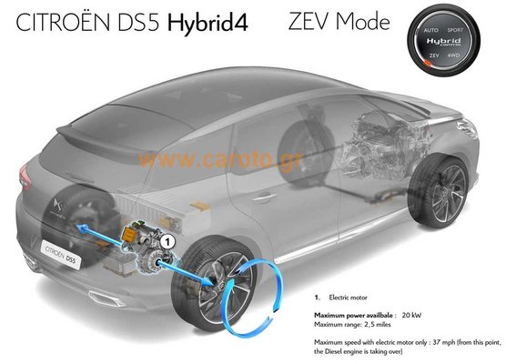- ZEV (Zero Emission Vehicule): η ηλεκτροκίνηση είναι εφικτή αρκεί η ταχύτητα να μην ξεπερνά τα 59 km/h (μετέπειτα εμπλέκεται ο ντίζελ) και για μέγιστη απόσταση 4 km. H προσφερόμενη ισχύς είναι 27,2 PS, για επιπλέον ισχύ συνδράμει ο ΜΕΚ ανεξαρτήτως ταχύτητας του οχήματος.