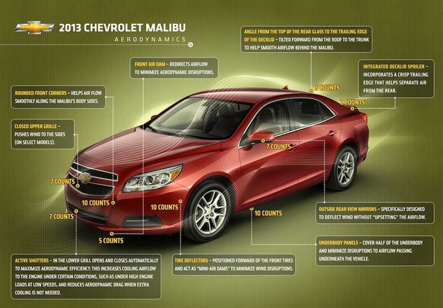 • Καταρχήν, να πούμε πως το Malibu δεν είναι τόσο… ξένο όσο ακούγεται αφού το περιμένουμε στην Ελλάδα μέσα του 2012 για να αντιμετωπίσει οικογενειακά μοντέλα όπως είναι τα Ford Mondeo, Citroen C5, Toyota Avensis, Skoda Superb κ.α. Το ειδικό βάρος του νέου μοντέλου της Chevrolet θα αναλάβει η ντίζελ έκδοση των 2,0 lt με 164 PS καθώς ο βενζινοκινητήρας με τους 170 PS έχει «μεγάλο» για τα ελληνικά δεδομένα κυβισμό.chevrolet-malibu-aerodynamics