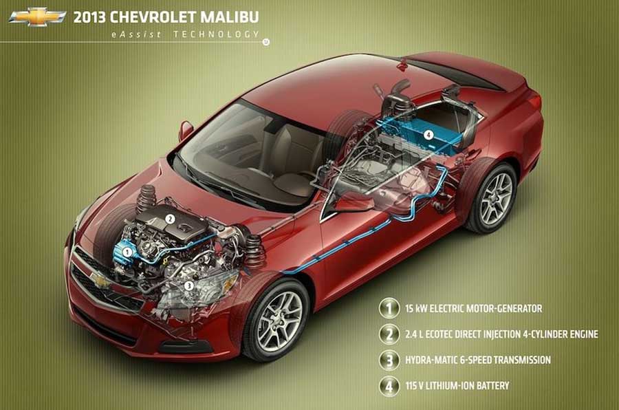 • Επί της ουσίας, το Malibu θα είναι το πρώτο μοντέλο της Chevrolet με υβριδικό χαρακτήρα και οι πωλήσεις της έκδοση eAssist θα ξεκινήσουν στην αμερικανική αγορά αρχές 2012. Το eAssist το είδαμε για πρώτη φορά στην Buick και συνδυάζει ηλεκτροκινητήρα 11 kW με τον βενζινοκινητήρα των 2,4 lt. Οι μπαταρίες λιθίου-ιόντων 0,5 kW με 32 στοιχεία είναι αερόψυκτες και ζυγίζουν 29 kg ενώ η συνδυασμένη ισχύς του συστήματος φτάνει τους 182 PS.