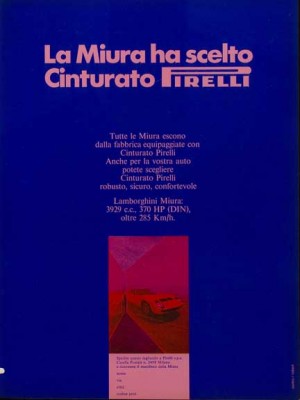 Η συνεργασία μεταξύ Pirelli και Lamborghini δεν είναι απλά τεχνικού χαρακτήρα. Μοντέλα Lamborghini συχνά πρωταγωνιστούν σε διαφημίσεις της Pirelli.  Η Lamborghini Countach Anniversary, για παράδειγμα, χρησιμοποιήθηκε σε μία σειρά διαφημιστικών της Pirelli σε όλη την Αμερική και Νοτιοανατολική Ασία, ενώ η Miura ήταν η σταρ σε μία διαφήμιση του 1970 για ελαστικά ΟΕ της Pirelli. Η διαφήμιση απλά αλλά απόλυτα πειστικά δήλωνε το εξής: «Η Miura επέλεξε Pirelli Cinturato.”