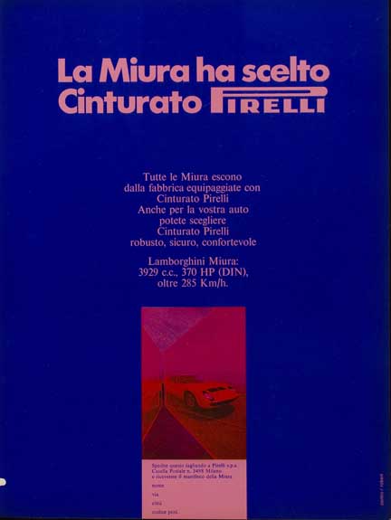 Miura 1970Η συνεργασία μεταξύ Pirelli και Lamborghini χρονολογείται από το 1963: τη χρονιά στην οποία ο Ferruccio Lamborghini θέλησε να εφοδιάσει το πρώτο του αυτοκίνητο με ελαστικά Pirelli. Αυτό ήταν το 350 GTV, που λανσαρίστηκε σαν πρωτότυπο στο Σαλόνι Αυτοκινήτου του Τορίνο την ίδια χρονιά.