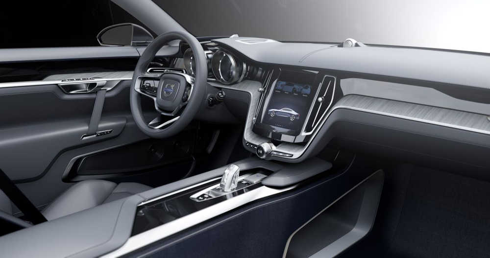 Μεγάλη οθόνη, επίσης στην κεντρική κονσόλα, διαθέτει και το πολύ όμορφο Volvo Concept Coupe, την οποία πλαισιώνουν ελάχιστα κουμπιά στο κάτω μέρος της. Οι Σουηδοί απ’ ότι φαίνεται αλλάζουν λογική προσέγγισης, αποσυνδέουν το premium από το πλήθος των κουμπιών στην κονσόλα –τα μοντέλα τους είχαν και έχουν πολλά- και κάνουν τα πάντα πολύ πιο απλά. Και σύγχρονα, ενώ το πιο πιθανό είναι η κονσόλα του Concept Coupe και η λογική της να χρησιμοποιηθούν αυτούσια στο πολύ-αναμενόμενο XC90.
