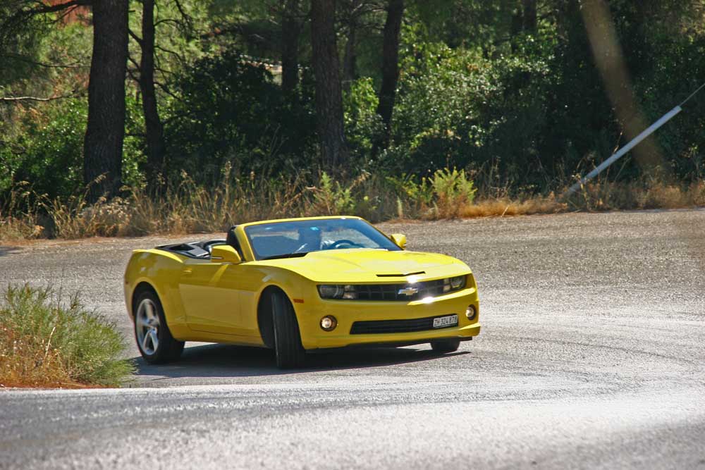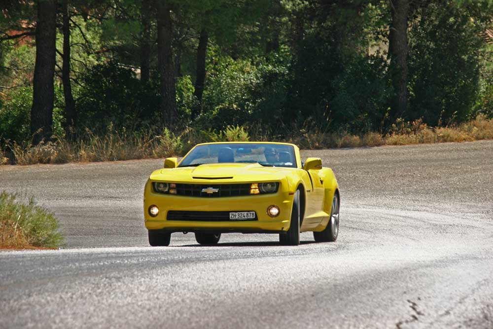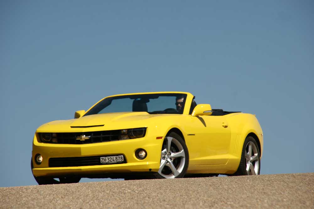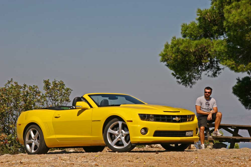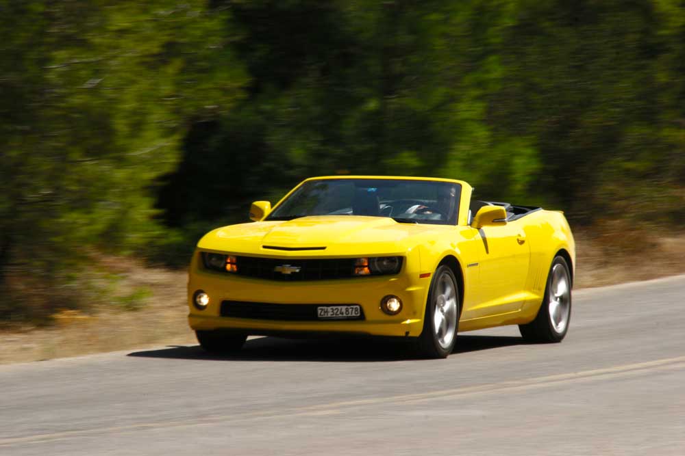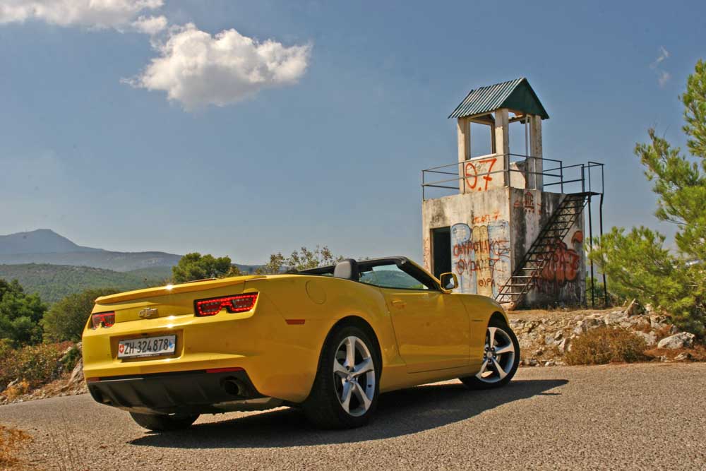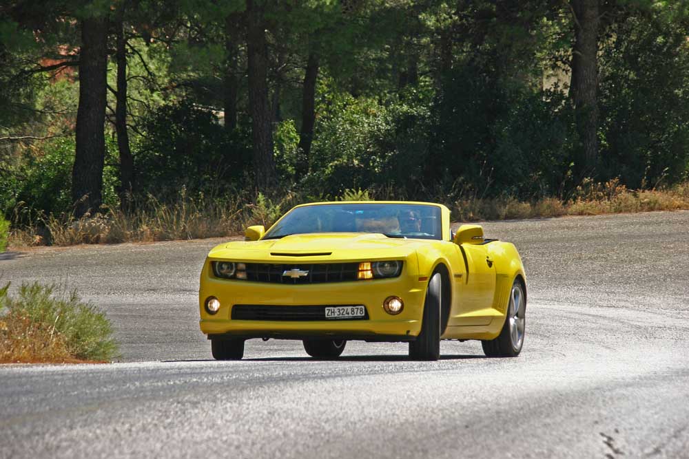 Σοκ και δέος. Για την ακρίβεια πρώτα έρχεται το «σοκ» όταν σε μια απαγορευτική -για τα δίλιτρα και άνω επιβατικά- αγορά συναντάς μια V8 κατασκευή 6.162 cc και κατόπιν έρχεται το «δέος» περιμένοντας η φανταχτερά κίτρινη Camaro να μεταμορφωθεί σε Transformer. «Πάτα το κουμπί να γίνει τώρα ρομπότ!», φωνάζει ένας πιτσιρικάς από το πεζοδρόμιο. Φυσικά, το μόνο μπουτόν μετάλλαξης στην Camaro -με τις ελβετικές πινακίδες που είχαμε στην διάθεσή μας για μερικές απολαυστικές μέρες- είναι αυτό της ηλεκτροκίνητης μαλακής οροφής.