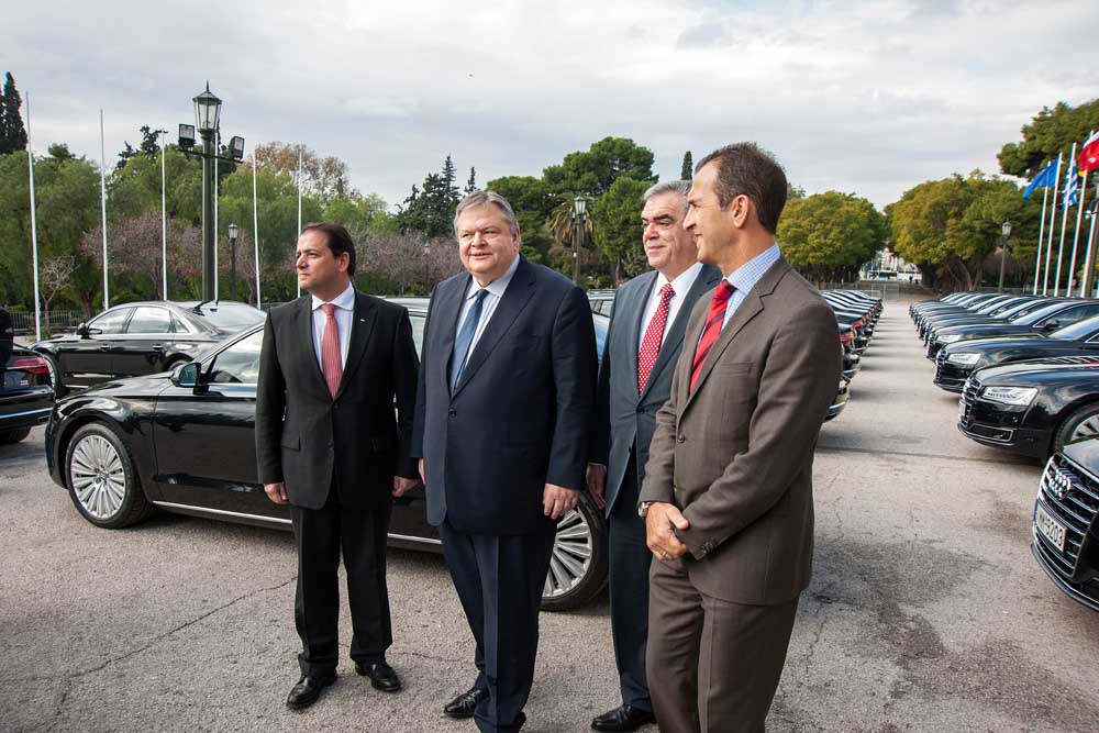 Στην τελετή που πραγματοποιήθηκε στο Ζάππειο, παραμονή της ανάληψης της Προεδρίας, η Kosmocar A.E.- Audi παρέδωσε επίσημα στο υπουργείο Εξωτερικών 45 συμβατικά αυτοκίνητα Audi Α6 και Α8 τριών όγκων (τύπου λιμουζίνας) αλλά και κάποιες θωρακισμένες εκδόσεις των μοντέλων. Επιπλέον ένας υποστηρικτικός στόλος 24 οχημάτων Audi μεταξύ άλλων: Audi A1, Audi A3, Audi A3 Sportback, Audi A4 & A5 Sportback παραχωρήθηκαν στο Υπουργείο Εξωτερικών προκειμένου να καλύψει όλες τις ανάγκες της Ελληνικής Προεδρίας μέχρι τον Ιούλιο του 2014.