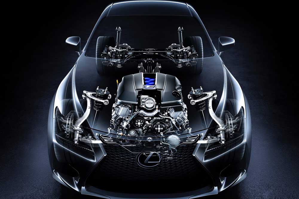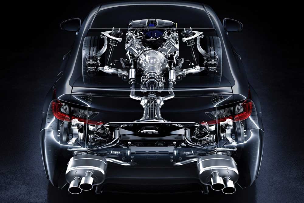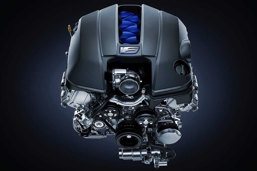 Το 32-βάλβιδο μοτέρ είναι ατμοσφαιρικό και συνδυάζει κύκλο Atkinson στις χαλαρές ταχύτητες (cruising) για βέλτιστη κατανάλωση ενώ η ροπή περνά στους πίσω τροχούς μέσω του αυτόματου κιβωτίου -πιθανότατα της Aisin- SPDS (Sports Direct Shift) με 8 σχέσεις με ηλεκτρονικά ελεγχόμενο διαφορικό TVD (Torque Vectoring Differential). Όσον αφορά στις επιδόσεις η Lexus λέει πως το RC F είναι ταχύτερο από το IS F που είχε το 0-96 km/h σε 4,6 sec ενώ η τελική ταχύτητα περιορίζεται ηλεκτρονικά στα 270 km/h.