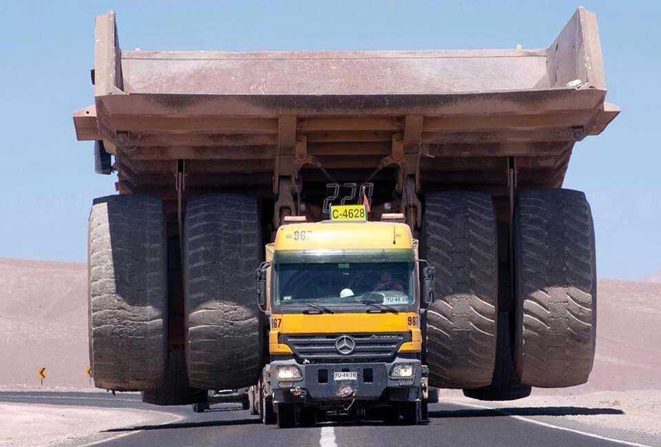 Υπάρχουν πολύ λίγα φορτηγά που είναι μεγαλύτερα από το Caterpillar 797 το οποίο ζυγίζει περίπου 360 τόνους. Στην φωτογραφία, μάλλον φαίνεται το πρώτης γενιάς 797 που εξοπλίζεται με V12 τούρμπο ντίζελ με 3.200 άλογα και ρεζερβουάρ 3.785 λίτρα! Τα Caterpillar 797 κατασκευάζονται στο Illinois των ΗΠΑ και κυκλοφορούν στα μεγαλύτερα ορυχεία μεταλλευμάτων στον κόσμο. Πάντως, αν και παλαιότερης γενιάς, το Actros δείχνει να μην μασάει από το τεράστιο φορτίο που έχει πάνω του. Αξιοσημείωτη λεπτομέρεια, τα αριστερά «τελειωμένα» λάστιχα της Michelin (είναι αποκλειστικός προμηθευτής για τα Caterpillar 797). Αλήθεια, γνωρίζετε ποιο είναι το μεγαλύτερο ελαστικό στον κόσμο;