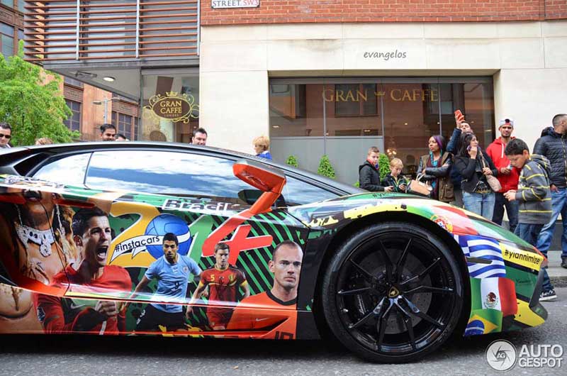 Το φετινό καλοκαίρι ανήκει στο Μουντιάλ της Βραζιλίας και λογικό είναι να βλέπουμε ανάλογες προωθητικές ενέργειες ή ακόμη και κάποιες εξατομικευμένες, όπως στην περίπτωση της Aventador που εθεάθη στο Λονδίνο (από τον Evangelos Photography). Φυσικά, πρόκειται για αυτοκόλλητα όπου μπορεί κανείς να ξεχωρίσει διάφορα αστέρια όπως τον Cristiano Ronaldo (τον πιο ακριβοπληρωμένο ποδοσφαιριστή στον κόσμο), τον Lionel Messi, τον Mesut Ozil, τον Ander Iniesta κ.α. ενώ σε περίοπτη θέση (στο εμπρός δεξί φτερό) βρίσκεται και η ελληνική σημαία!