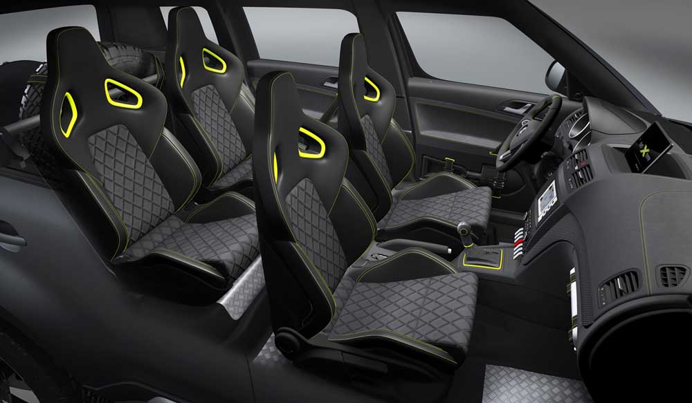 Πέρα από τους χρωματικούς συνδυασμούς που διασκεδάζουν το εσωτερικό υπάρχουν και τέσσερα μπάκετ καθίσματα Recaro μαζί με μεταλλικό δάπεδο -αντί για μοκέτα- και αλουμινένια πεντάλ. Ελαφρώς διαφοροποιημένη είναι η κεντρική κονσόλα, που διαθέτει και βάση για iPad, ενώ στο πορτμπαγκάζ πέρα από τη ρεζέρβα που είναι δεμένη με ιμάντες υπάρχει κι ένα φτυάρι για «κολλημένες» καταστάσεις.