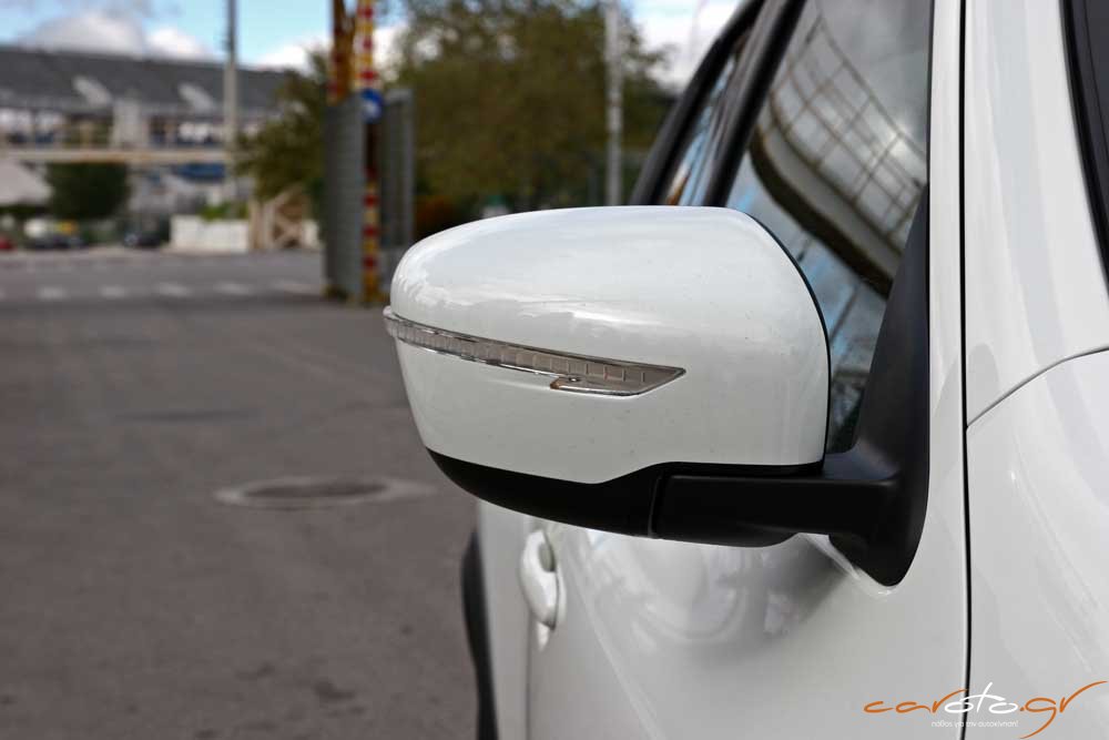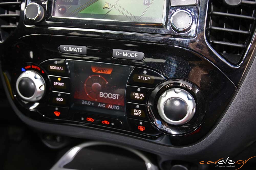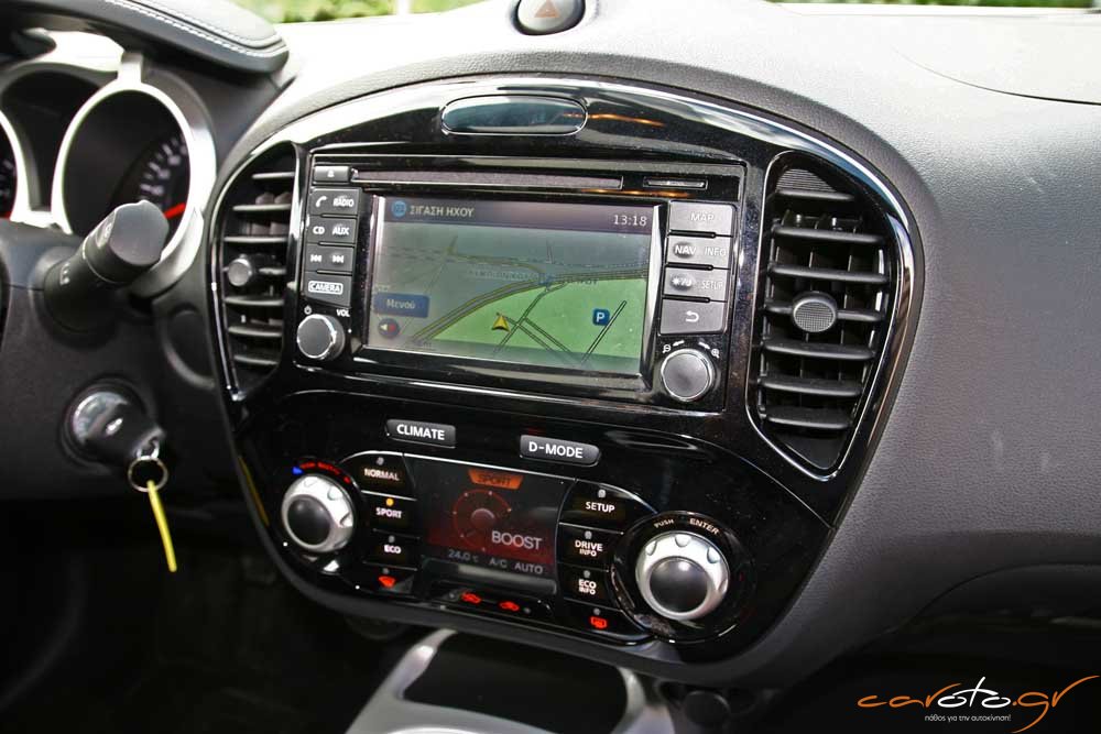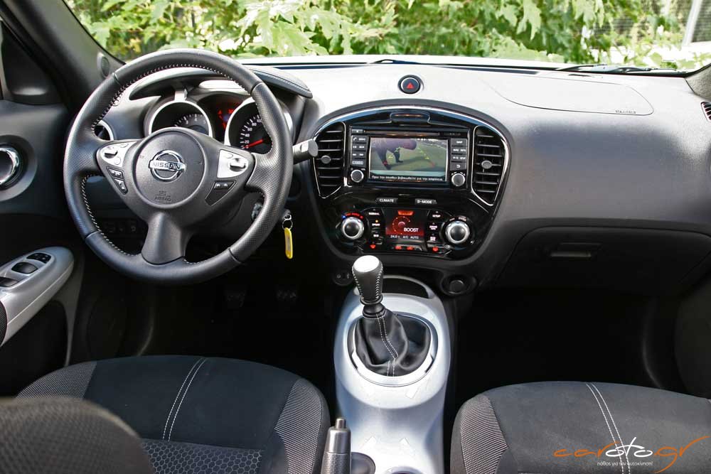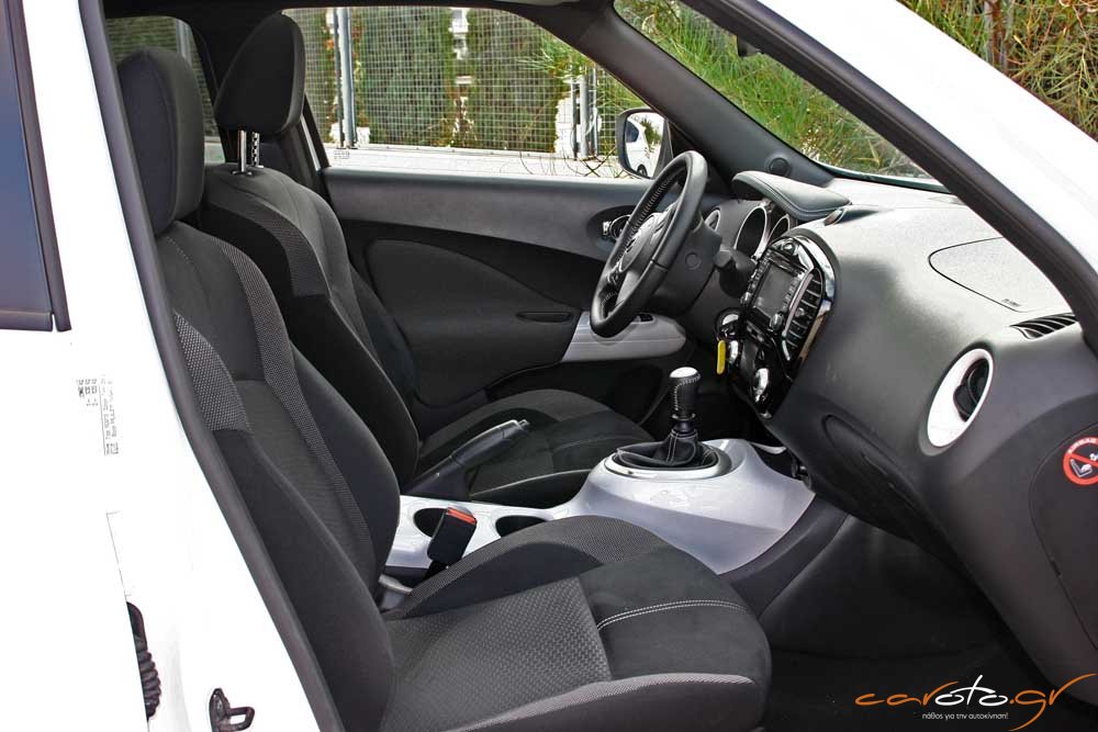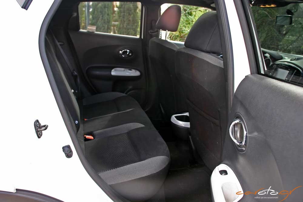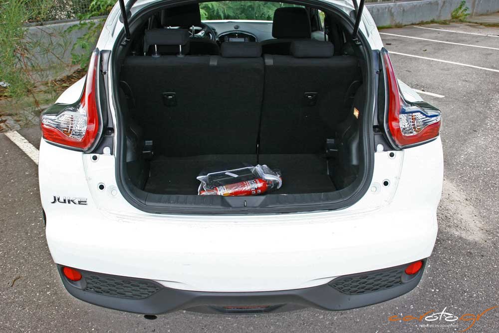 Πάντως, το Juke δεν στερείται πρακτικότητας με βαθιές ποτηροθήκες και χώρους για μικροαντικείμενα, ενώ η πλούσια έκδοση της δοκιμής μας έχει από διακοσμητικά πάνελ στο ταμπλό έως και μία πανοραμική γυάλινη οροφή. Πολύ σοφή όσο και πρακτική είναι η διεύρυνση του χώρου αποσκευών με καλύτερη εκμετάλλευση σε βάθος, ώστε ο διαθέσιμος χώρος να φτάνει τα 354 lt (από τα 251 του απερχόμενου μοντέλου, αύξηση κατά 40%).