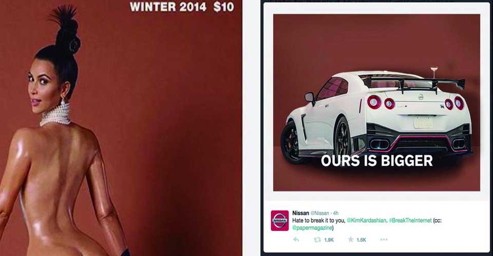 Το σίγουρο είναι πως κάποιοι στην Nissan έχουν αρκετό χιούμορ, όσο και ευρηματικότητα στο μάρκετινγκ καθώς έχει γίνει χαμός με την φράση «Ours is bigger» δείχνοντας το ντοπαρισμένο πίσω μέρος του Nissan GT-R NISMO των 600 αλόγων. Το οποίο κοστίζει μόλις 150.000 δολάρια, αν σκεφτεί κανείς πόσο αξίζουν μόνο τα καπούλια της Kardashian (γνωστή και για το sex tape), η οποία τελευταία αποτέλεσε αντικείμενο σχολιασμού μέχρι και του Obama.