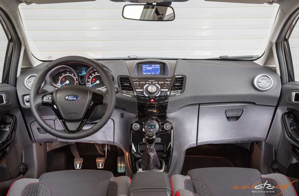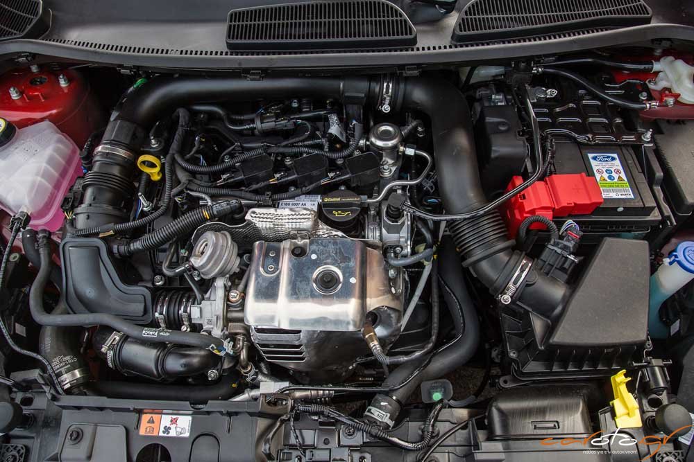 Αυτά τα εξαιρετικά χαρακτηριστικά συνδυάζονται με χαμηλή κατανάλωση (7,5 lt/100 km σε πραγματικές συνθήκες καταγράψαμε εμείς) και κατά συνέπεια με περιορισμένες εκπομπές ρύπων (104 g/km). Αυτό που μας έκανε εντύπωση είναι ότι το μοτέρ είναι αρκετά αθόρυβο. Θα θέλαμε λίγο ηχητικό «αλατοπίπερο» από ένα Fiesta που στις σπορ εκδόσεις του έχει σύστημα ενίσχυσης του ήχου του κινητήρα. Αλλά από την άλλη μας άρεσε που στις μακρινές διαδρομές μπορούσαμε να ακούμε τη μουσική από το ραδιόφωνο.