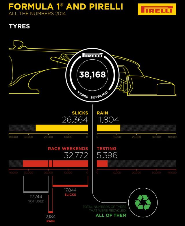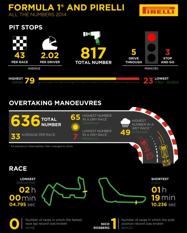 Παρουσιάζει ιδιαίτερο ενδιαφέρον η ανάλυση που επιχειρεί η Pirelli όσον αφορά στο 2014 από πλευράς ελαστικών. Οι αριθμοί αποκαλύπτουν με ξεκάθαρο τρόπο την εξέλιξη που επιτεύχθηκε κατά τη διάρκεια της χρονιάς.