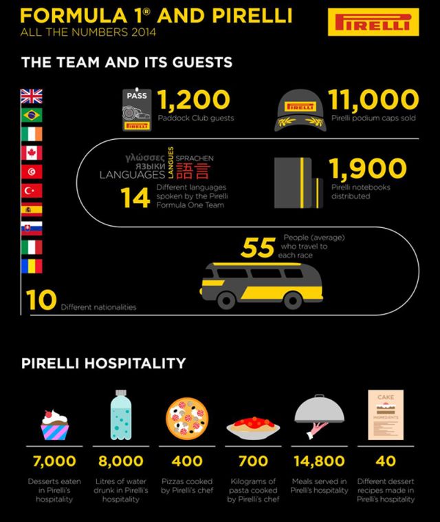 Όπως εξηγεί ο αγωνιστικός διευθυντής της Pirelli, Puul Hembery: «Κάθε χρόνο, δημοσιεύουμε τους αριθμούς που διαμορφώνουν την ιστορία  της σεζόν στη F1. Το 2014 αντιμετωπίσαμε τη μεγαλύτερη πρόκληση από τότε που ξεκίνησε η εμπλοκή μας στο σπορ, λόγω μιας εντελώς νέας γενιάς μονοθεσίων με διαφορετικά χαρακτηριστικά από πριν. Παρόλα αυτά, πετύχαμε όλους τους στόχους μας, δηλαδή να συμβάλλουμε στη διεξαγωγή συναρπαστικών αγώνων, στα προσπεράσματα, στις επιλογές στρατηγικής και σε τουλάχιστον δύο pit stop/μονοθέσιο/αγώνα. Τα ελαστικά του 2015 είναι εξελιγμένες εκδόσεις των ελαστικών του 2014, και ένα  μόνο θα είναι εντελώς νέο: η πολύ μαλακή γόμα (supersoft) η οποία θα είναι νέα και όσον αφορά στην σύνθεση και όσον αφορά στο σκελετό».