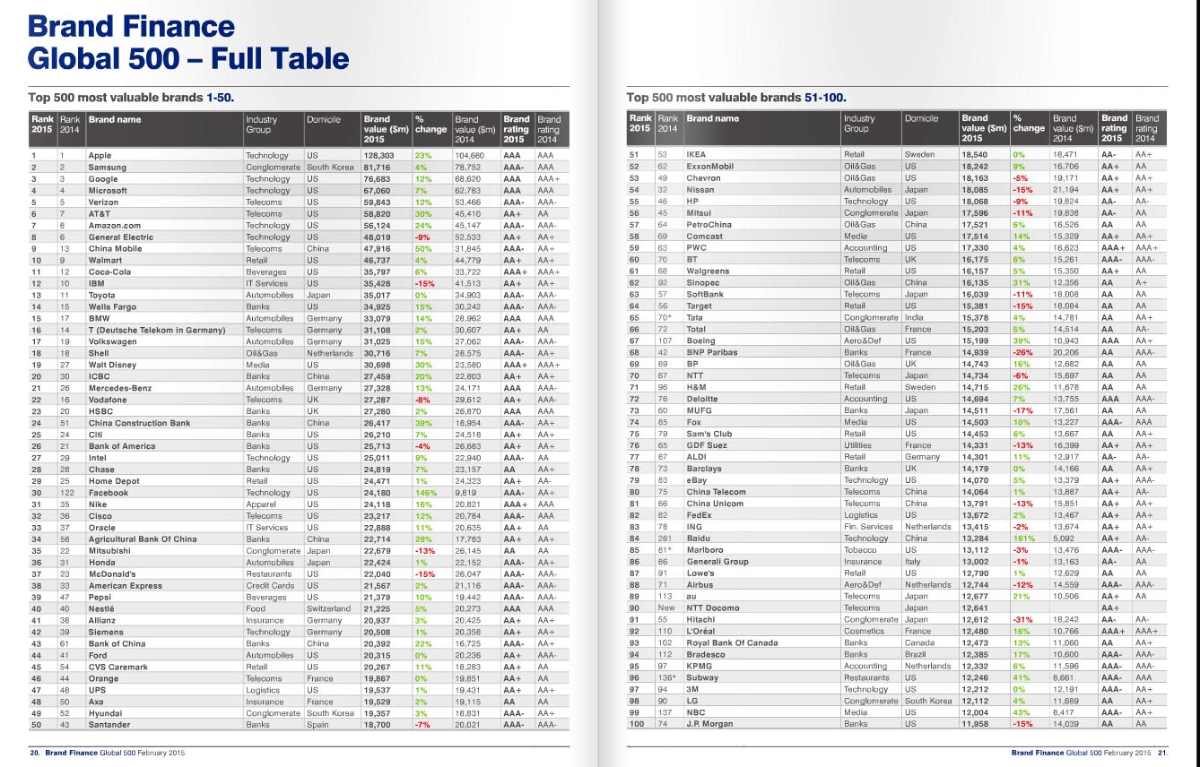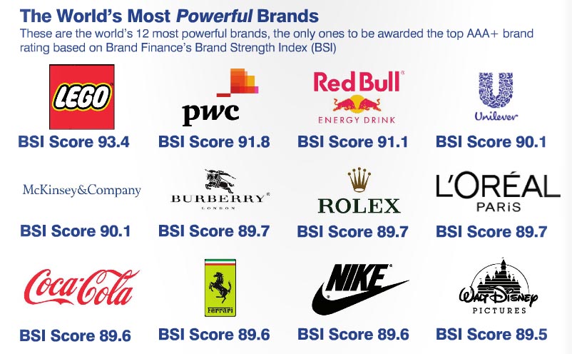 Για το 2014, η Lego κατάφερε να προσπεράσει την Ferrari, χάρη και στην προώθηση που έδωσε στην γνωστή εταιρία παιχνιδιών η μεγάλη επιτυχία της παραγωγής «Lego Movie» με έσοδα που ξεπέρασαν τα 500 εκ. δολάρια σε όλο τον κόσμο! Όπως μπορείτε να δείτε στην διπλανή εικόνα την Lego ακολουθούν οι PWC, Red Bull, Unilever, McKinsey, Burberry, Rolex, Loreal, Coca-Cola και η Ferrari μαζί με την NIKE. Παρακάτω μπορείτε να δείτε την λίστα με τις μεγαλύτερες σε αξία εταιρίες στον κόσμο.