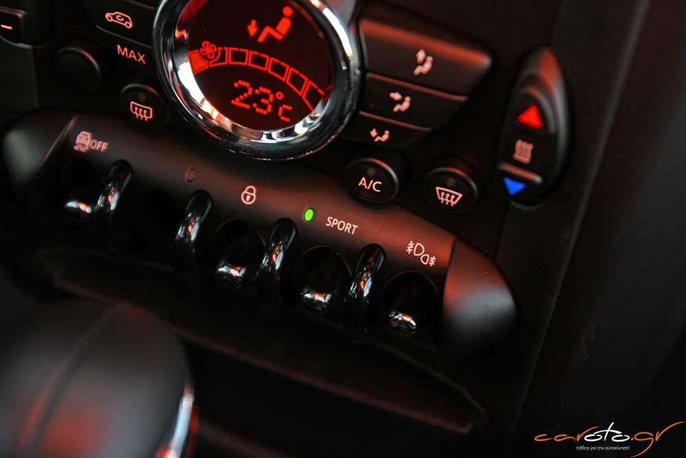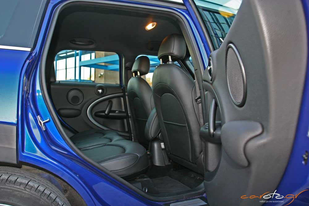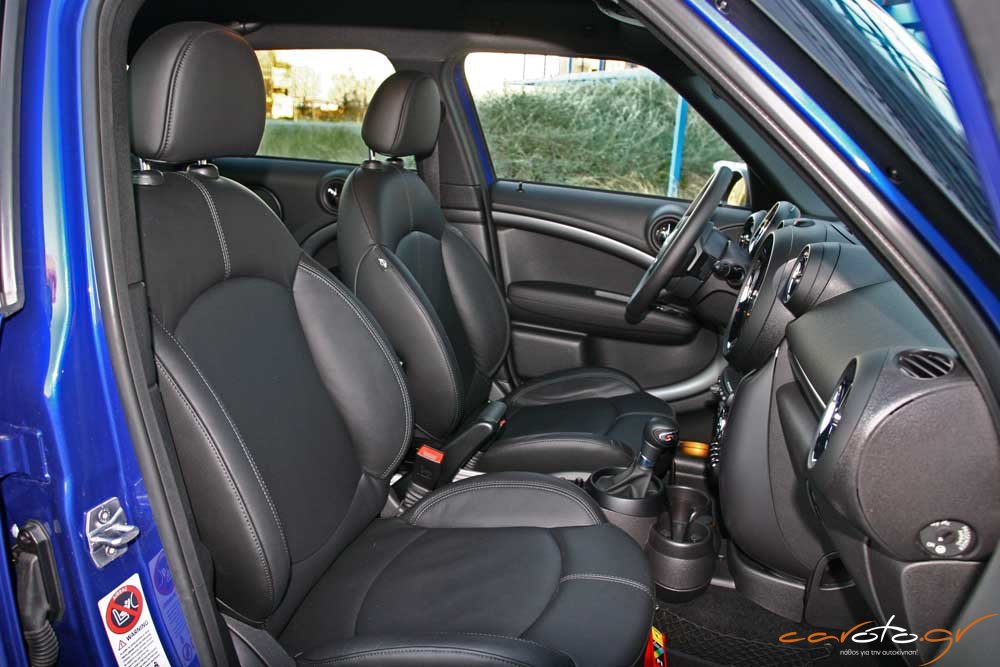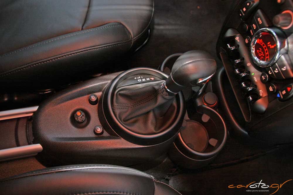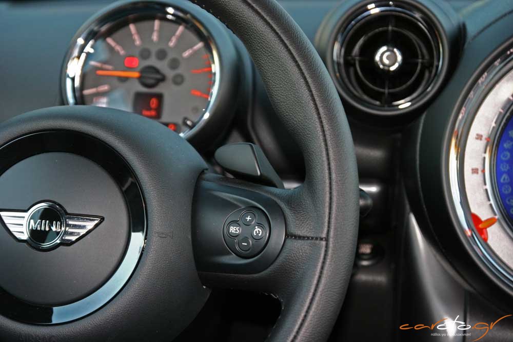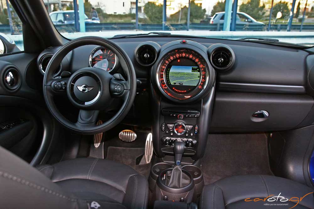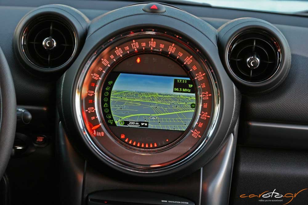Στο εσωτερικό, πάλι, συναντάμε νέες επενδύσεις και ταπετσαρίες, καθώς και βελτιώσεις στο θέμα της ηχομόνωσης της καμπίνας. Μικρές βελτιωτικές πινελιές σε έναν, ομολογουμένως, όμορφο καμβά. Το DNA της φίρμας δεν αφήνει περιθώρια για παρανοήσεις. Εδώ τα πάντα μυρίζουν Mini. Το “αεροπορικό” design, οι διακόπτες, τα χρησιμοποιούμενα υλικά και φυσικά το κεντρικά τοποθετημένο ταχύμετρο, που κρύβει μέσα του το σύστημα πλοήγησης και ο,τι άλλο προβάλλεται στην ευκρινή, έγχρωμη οθόνη. Το μόνο που δεν είναι mini είναι οι προσφερόμενοι χώροι. Το μεγάλο εσωτερικό ύψος και αντίστοιχα η απόσταση των δύο σειρών καθισμάτων θα κάνουν όλους τους άνω του 1.90 μ. να χαμογελάσουν. Όπως επίσης και όσους σκοπεύουν να κυκλοφορούν συχνά με 3-4 φίλους παρέα.