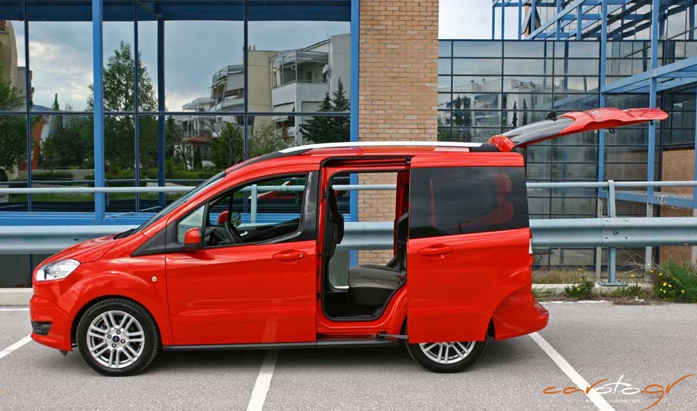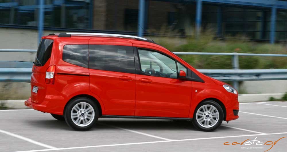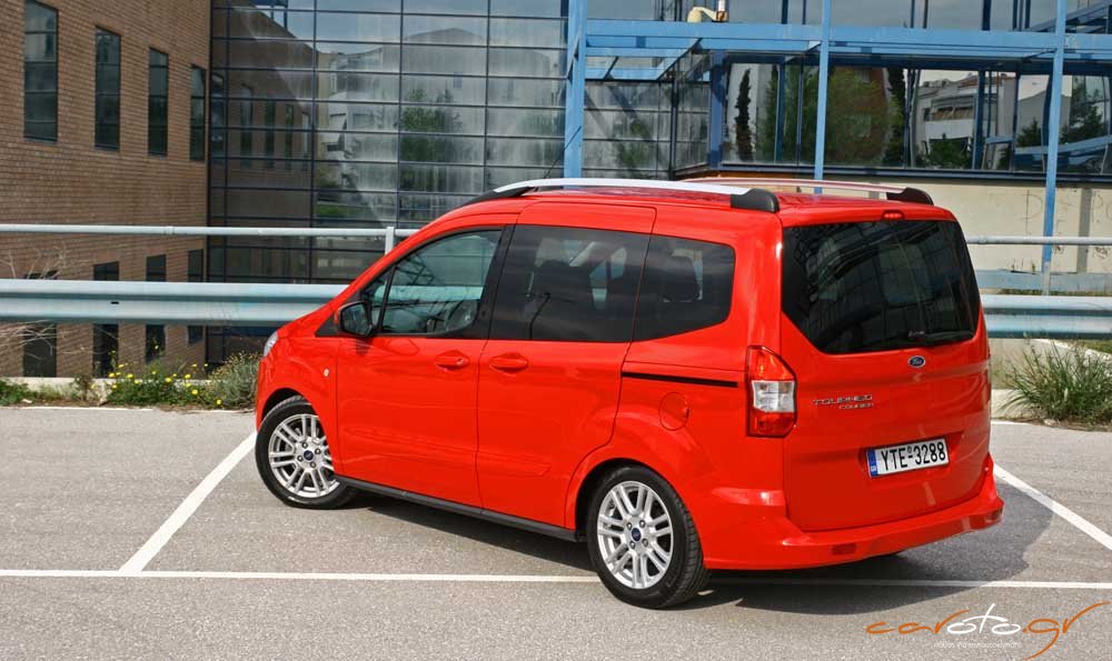 Δεν χρειάζεται και πολύ για να αντιληφθείς τον χαρακτήρα της επιβατικής έκδοσης του Tourneo. Καταρχήν, διαφέρει αρκετά από τα πιο επιβατικά C-MAX και S-MAX, τόσο από την σχεδίαση, όσο και από τις διαστάσεις του αμαξώματος. Το μήκος του αμαξώματος είναι στα 4,2 μέτρα προσφέροντας αστική ευελιξία όταν ταυτόχρονα το ύψος του φτάνει τα 1,72 μέτρα με περίσσεια αέρα πάνω από τα κεφάλια. Ένα χαρακτηριστικό της του πρακτικού χαρακτήρα του αυτοκινήτου είναι οι συρόμενες πίσω πόρτες (με κρύσταλλα που ανοίγουν μερικώς με άγκιστρο), καθώς και η μονοκόμματη πίσω πόρτα του πορτμπαγκάζ (δύο στοιχεία που υπάρχουν στην ελαφρά επαγγελματική έκδοση του Tourneo) με το χαμηλό και βολικό κατώφλι φόρτωσης.