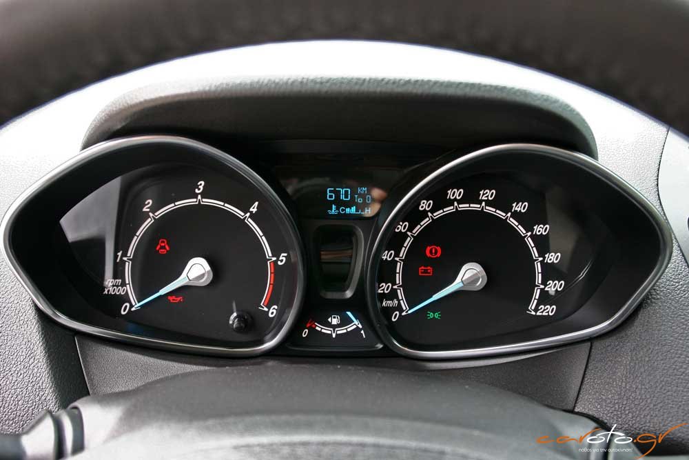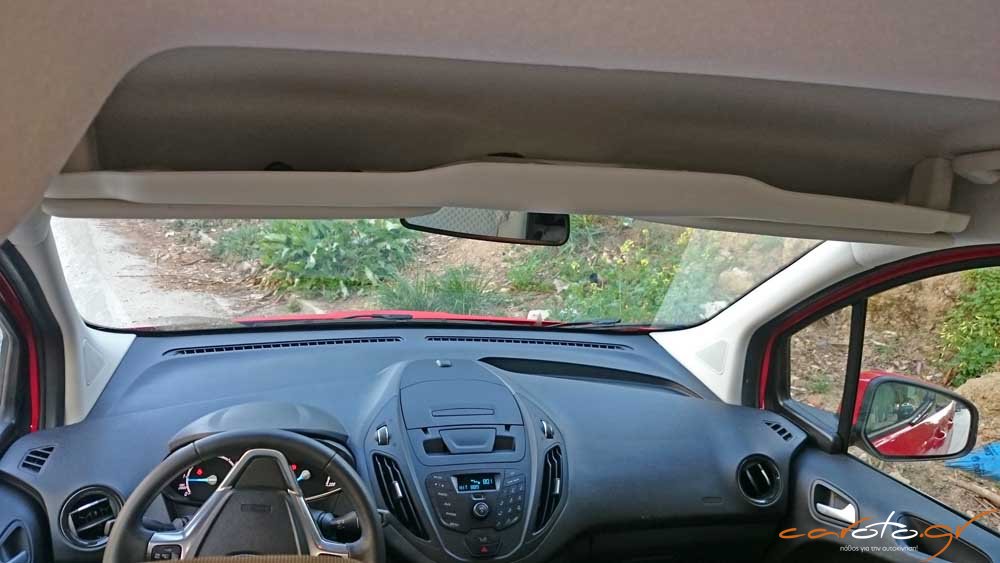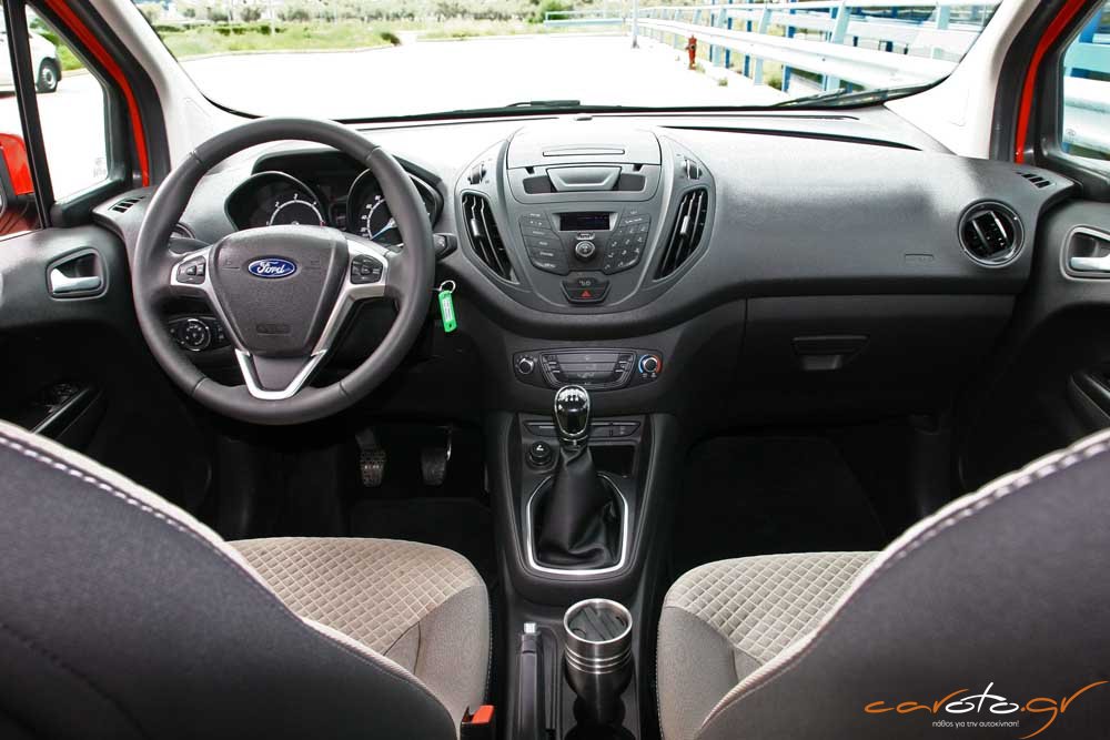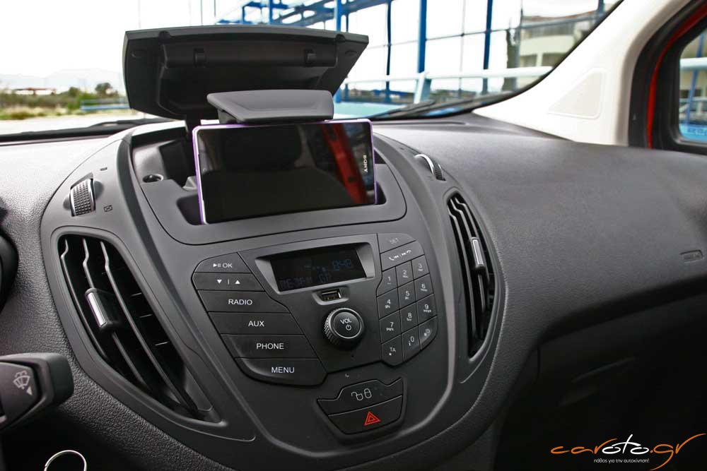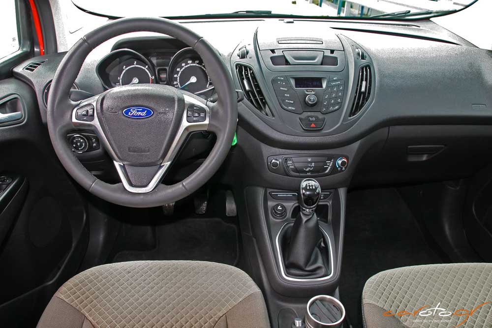 Σχεδιαστικά το ταμπλό βασίζεται στο μοτίβο του Fiesta και χαρακτηρίζεται από τις πολλές θήκες για μικροαντικείμενα. Στο πάνω μέρος υπάρχει μία πρακτική πτυσσόμενη θήκη για κινητό τηλέφωνο, οι ποτηροθήκες είναι βολικές, υπάρχει θύρα USB και Bluetooth, αυτόματο σύστημα φώτων, αν και θα θέλαμε μία κάπως μεγαλύτερη οθόνη για τις ενδείξεις. Πολύ πρακτικό είναι το ράφι στην περιοχή της πλαφονιέρας, θυμίζοντας τον επαγγελματικό χαρακτήρα του αυτοκινήτου.