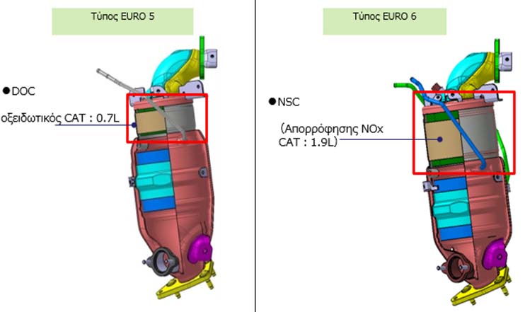 Νέο συγκρότημα φίλτρων (Catalyzed Soot Filter-CSF) με καινούργιες επιφάνειες των στρωμάτων από νέα υλικά (Ag/Pd – Silver/Palladium).- Η προσθήκη Παλλάδιου στο Ασήμι επέτρεψε την υψηλότερη αντοχή του στην οξείδωση αυξάνοντας έτσι την αντοχή του CSF.