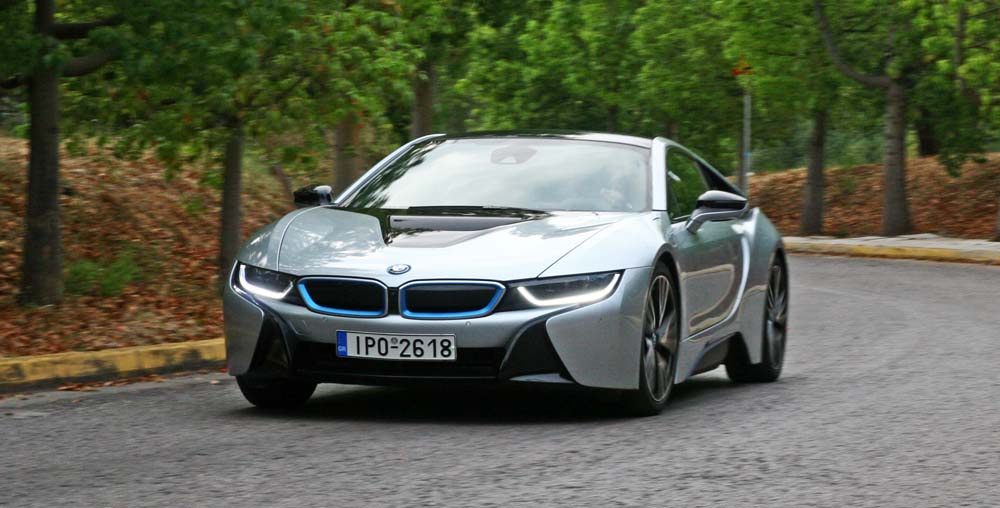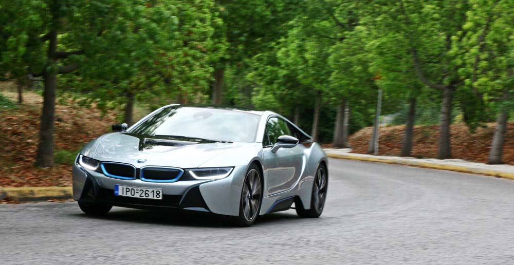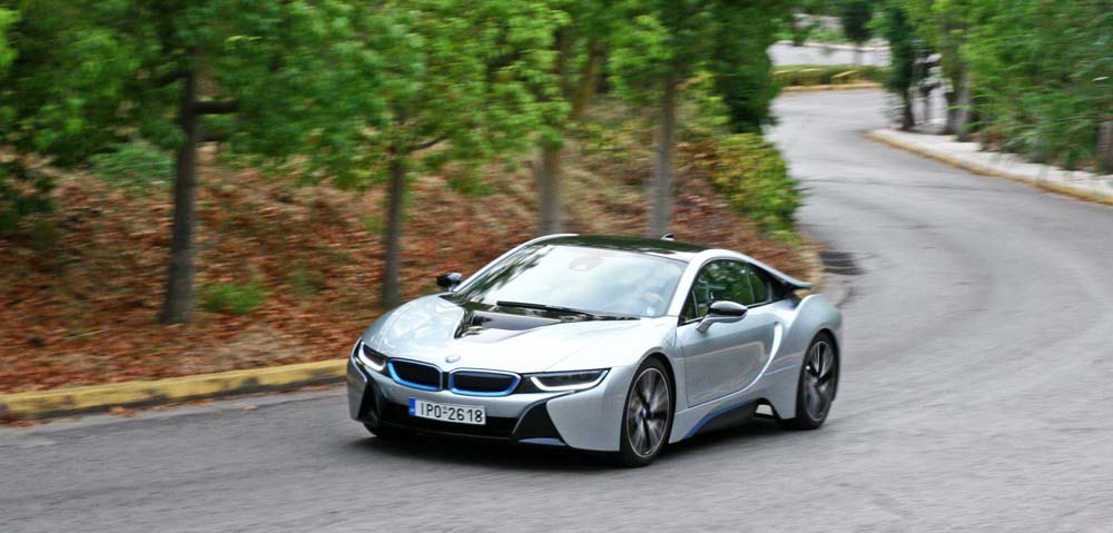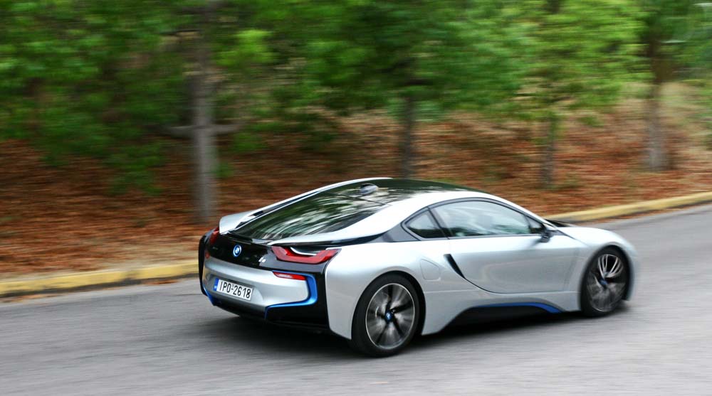 Από εκεί και πέρα τα 4,4 sec για το 0-100 του κατασκευαστή γίνονται άμεσα αντιληπτά από τον τρόπο που το i8 επιταχύνει και σε κολλάει στο κάθισμα. Πολύ ωραίος ήχος με “σκασίματα” στα κατεβάσματα, εξαιρετικός ο 3κύλινδρος βενζινοκινητήρας που δείχνει πόσο πολύ μπορεί να προχωρήσει το downsizing. Πολύ γρήγορο το διπλοσύμπλεκτο κιβώτιο 6 σχέσεων, αν και στα κατεβάσματα μερικές φορές δείχνει απροθυμία, ίσως για λόγους προστασίας του συστήματος που περιλαμβάνει και έναν κόμπακτ ηλεκτροκινητήρα που λειτουργεί σαν μίζα, γεννήτρια για τις μπαταρίες και ως ηλεκτρικό boost για τον 3-κύλινδρο εξαλείφοντας εντελώς το lag. Το τιμόνι άμεσο και κοφτερό στο Sport, δυνατά τα φρένα της Brembo.