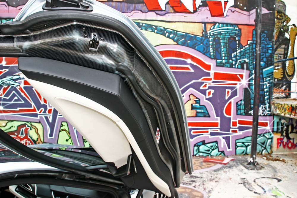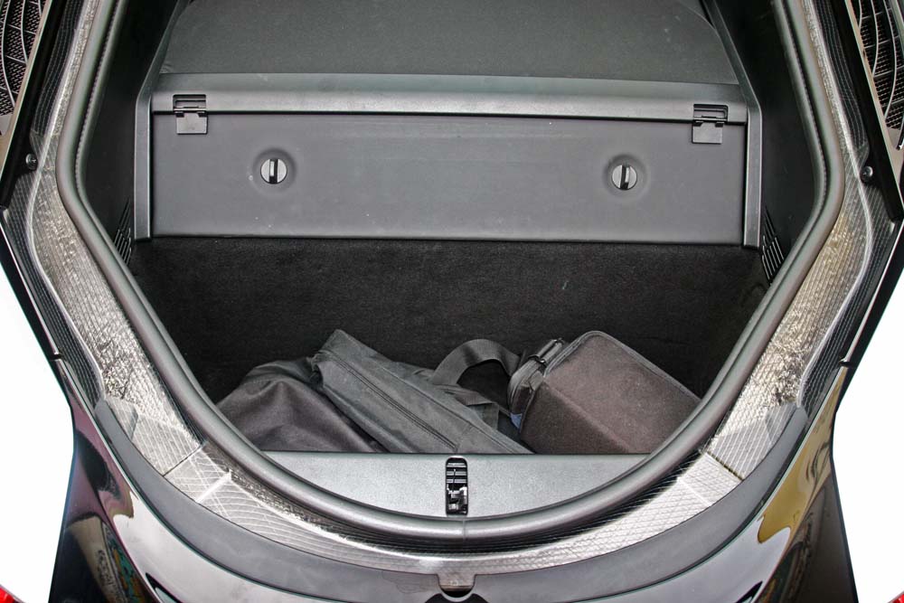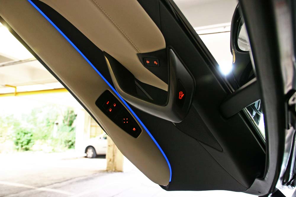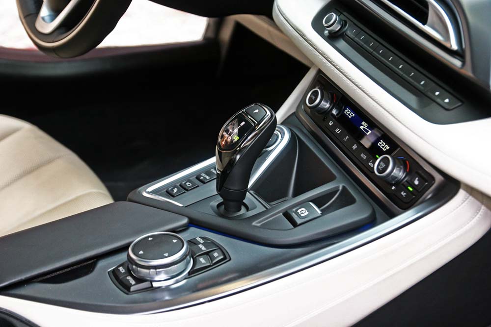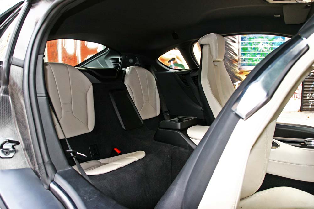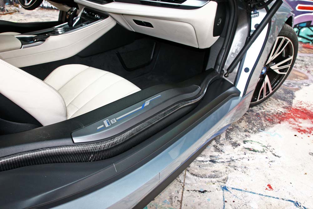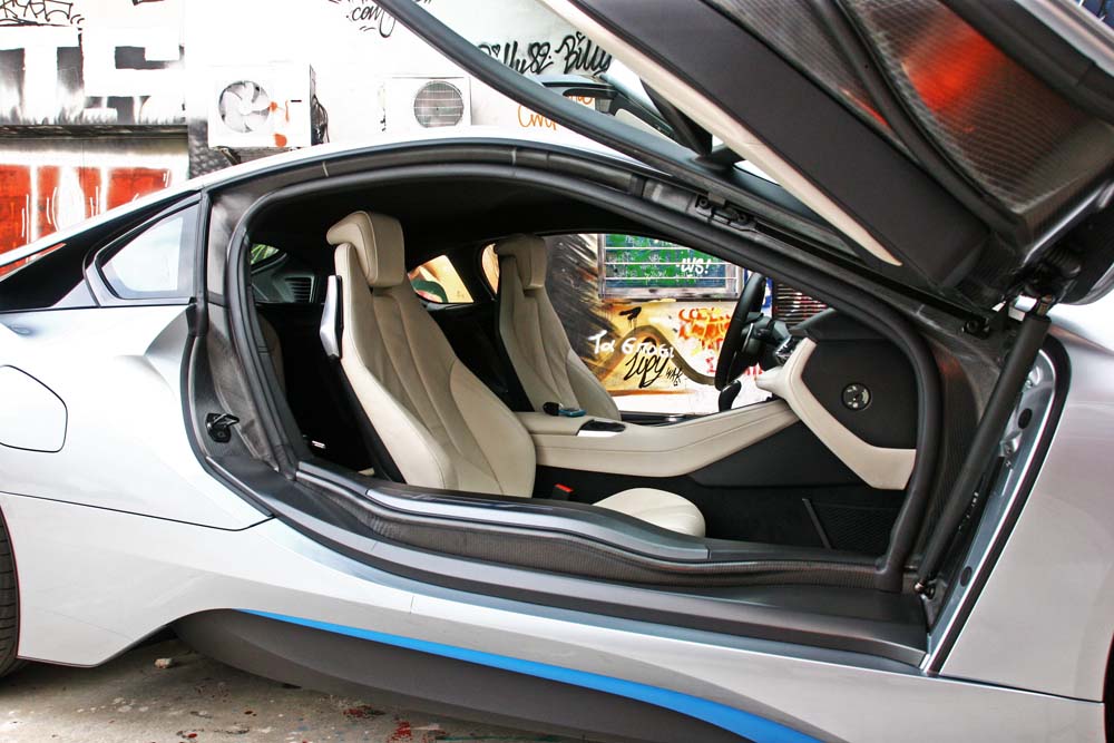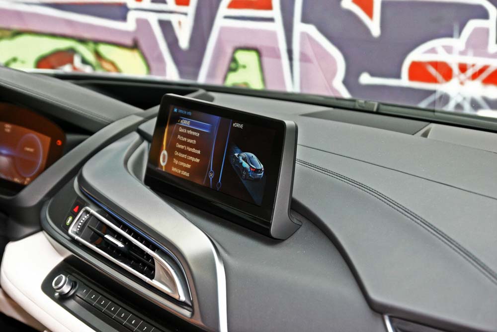 Αν και το μάτι δεν χορταίνει ποτέ απέναντι στο πανέμορφο i8, το επόμενο πράγμα που θέλεις είναι να σηκώσεις τις κάθετα ανοιγόμενες πόρτες (όπως σε μία Lamborghini) και να βρεθείς μέσα σε ένα άκρως εντυπωσιακό κοκπιτ βγαλμένο από το αύριο. Πίσω από το αλουμινένιο πλαίσιο με τον CFRP κλωβό, το σάντουιτς ανθρακονήματος είναι ορατό -όπως και στο BMW i3– σε αρκετά σημεία, ενώ το μεταμοντέρνο στιλ ενισχύεται από το φουλ ψηφιακό πίνακα οργάνων, την φαρδιά κεντρική κονσόλα και όλα τα καλά που θα μπορούσε να έχει ένα space σπορ αυτοκίνητο. Μπορεί να ακουστεί περίεργο, αλλά παρά το πολύπλοκο σύστημα πρόωσης, η διάταξη στο εσωτερικό είναι μία σχετικά ευρύχωρη “2+2”. Εντάξει, μην φανταστείτε τίποτα σπουδαίο, αλλά δύο μικρά παιδιά θα χωρέσουν, ενώ πίσω υπάρχει και ένα μικρό πορτμπαγκάζ 154 lt (καλή τιμή για το είδος του αυτοκινήτου).