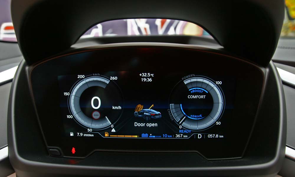 Η παραμικρή κατασκευαστική λεπτομέρεια είναι προσεγμένη ώστε το απόβαρο να μην ξεπερνά τα 1.490 kg και να διευκολύνεται το έργο του ηλεκτροκινητήρα ισχύος 96 kW (131 PS). Θεωρητικά, οι μπαταρίες λιθίου (βρίσκονται ανάμεσα στους δύο άξονες και χαμηλά για να εξασφαλίζεται ιδανική κατανομή βάρους 49/51 μπρος/πίσω) προσφέρουν αυτονομία για 35 km, αλλά πρακτικά αρκούν για 20-25 km μετά από 3ώρη φόρτιση σε οικιακό δίκτυο. Ο ηλεκτροκινητήρας κινεί μόνο τους εμπρός τροχούς, αρκεί η ταχύτητα να μην υπερβαίνει τα 120 km/h και ανάλογα με την βύθιση του πεντάλ του γκαζιού. Από εκεί και πέρα, εμπλέκεται ο γνωστός 3-κύλινδρος βενζινοκινητήρας που αποδίδει 231 άλογα! Ναι, τόσα πολλά από 1.500 κυβικά εκατοστά που καταναλώνουν αμόλυβδη με την ροπή των 320 Nm να μεταφέρεται αποκλειστικά στους πίσω τροχούς.