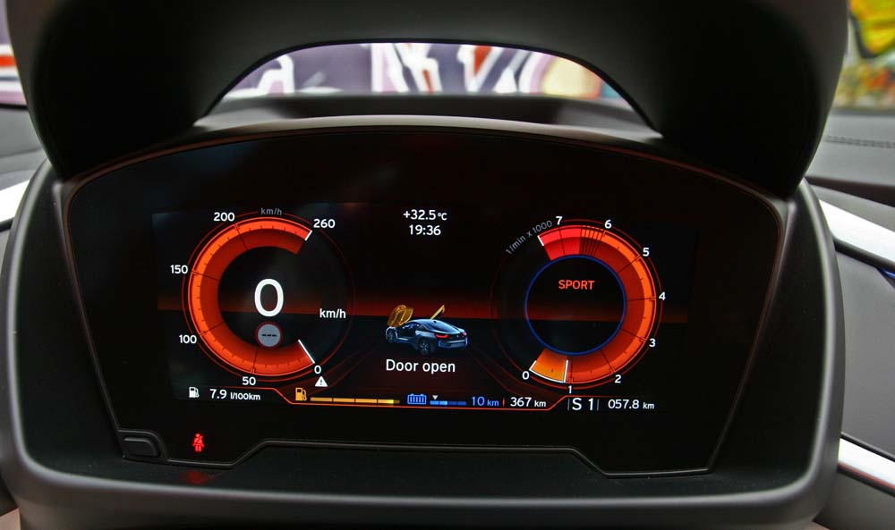 Από εκεί και έπειτα αναλαμβάνει ο 3-κύλινδρος με σχετικά αθόρυβη εμπλοκή στα προγράμματα Comfort και Eco (εδώ λειτουργεί ως ένα κλασικό υβριδικό PHEV, όπως περίπου το Volvo V60 που είχαμε δοκιμάσει). Τα πάντα αλλάζουν όταν επιλεχθεί το Sport, μετακινώντας τον 6άρι επιλογέα προς τα αριστερά. Τότε, ο πίνακας οργάνων αγριεύει και γίνεται κόκκινος… από το κακό του, ενώ ταυτόχρονα εμφανίζεται ένα μεγάλο στροφόμετρο. Ο ήχος αλλάζει και προσεγγίζει την μελωδία ενός V8, αλλά με τόσο τεχνητό τέμπο (σ.σ. η μία από τις δύο απολήξεις λειτουργεί σαν ηχείο!) που θυμίζει την διαφορά ενός δίσκου βινυλίου από ένα ψηφιακό αρχείο. Ομολογουμένως, στο θέμα της παραγωγής ήχου οι ειδικοί έχουν προσέξει την παραμικρή λεπτομέρεια αφού ακόμη και με ανεβασμένα τα παράθυρα ο ήχος παραμένει εντυπωσιακός (και αναπαράγεται από το ηχοσύστημα!).