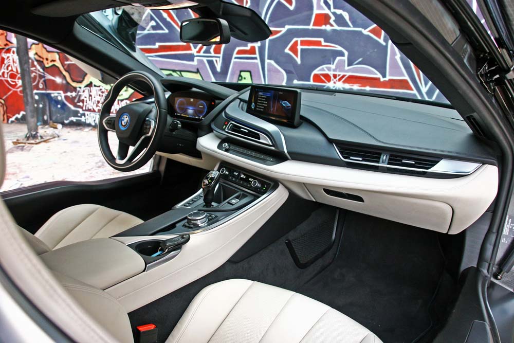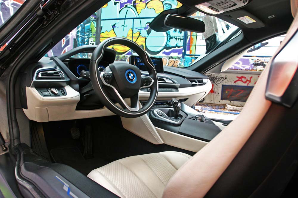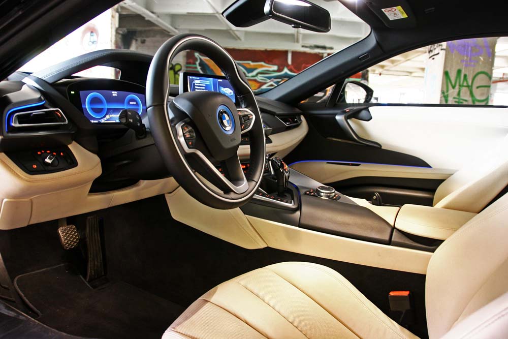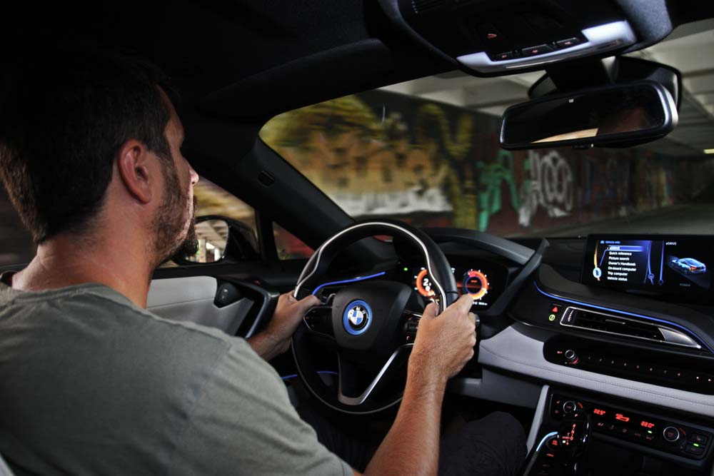 Η θέση οδήγησης είναι αρκετά χαμηλή, φάτσα-κάρτα έχεις ένα κλασικό BMW βολάν και δεξιά σου τον γνωστό στιλάτο επιλογέα. Πιέζοντας το διακόπτη εκκίνησης, υπό άλλες συνθήκες θα περίμενες να ακούσεις ένα μπάσο μουγκρητό… στο i8 ακούς μόνο το θρόισμα του ηλεκτρικού συστήματος πρόωσης. Η επιτάχυνση είναι άμεση στο πάτημα του γκαζιού και αθόρυβη, μέχρι να εξαντληθούν τα αποθέματα ενέργειας (δείτε στο τέλος ένα σχετικό βίντεο).