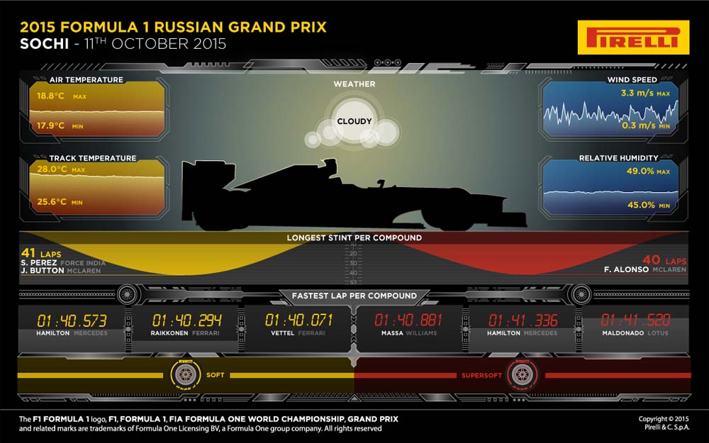 Ένα ακόμη βήμα πιο κοντά στο φετινό τίτλο έκανε ο Lewis Hamilton, επικρατώντας των ανταγωνιστών του στο ρωσικό Grand Prix. Έτσι στην τέταρτη θέση ανέβηκε ο Felipe Massa ενώ στην πέμπτη πλασαρίστηκε ο Kimi παρότι έκανε τον μισό τελευταίο γύρο με το μονοθέσιο του τραυματισμένο, να κινείται με αργό ρυθμό. Ακολούθησε ο τοπικός ήρωας, ο Kvyat, ο Felipe Nasr με τη Sauber, o Pastor Maldonado με τη Lotus και οι δύο McLaren-Honda. Εδώ μπορείτε να δείτε την κατάταξη στο πρωτάθλημα, επόμενος αγώνας στις ΗΠΑ (25/10), αναλυτικά η κατάταξη στην Ρωσία: