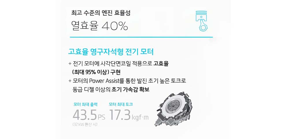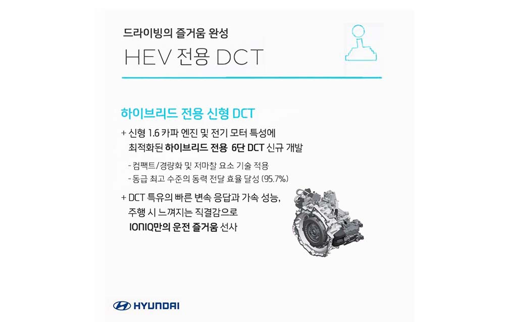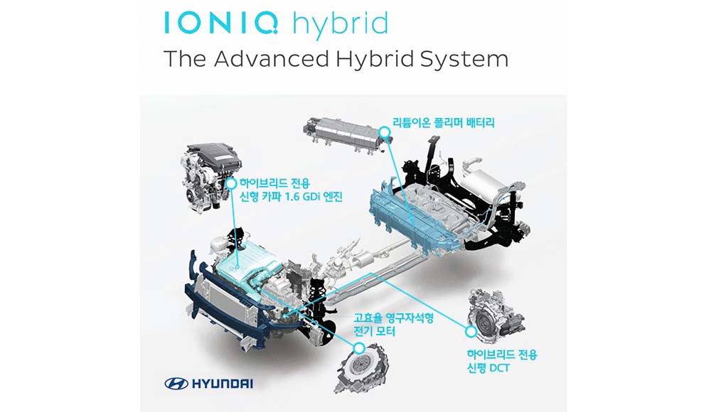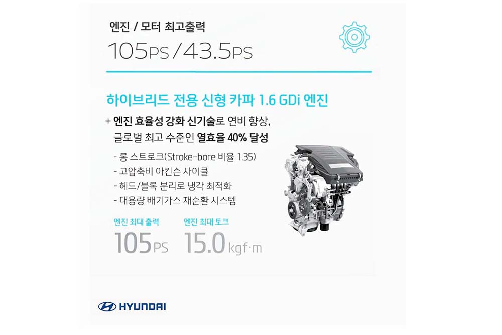 Δεν πέρασαν μερικές ώρες και η Hyundai επιβεβαίωσε τα όσα είχαμε γράψει καθώς το Ioniq θα συνδυάζει έναν ατμοσφαιρικό βενζινοκινητήρα 1.6 GDI με ισχύ 105 PS / 146 Nm με έναν ηλεκτροκινητήρα ισχύος 43,5 PS / 170 Nm που θα είναι ενσωματωμένος στο νέο DCT κιβώτιο διπλού συμπλέκτη. Η Hyundai μιλά για απόδοση του συστήματος πρόωσης στο 40% (όσο και του Toyota Prius), ενώ το μοτέρ έχει άμεσο ψεκασμό με μπεκ 6 οπών και πίεση κυκλώματος στα 200 bar. Αυτά προς το παρόν για την υβριδική έκδοση, ενώ αναμένουμε τα πρώτα στοιχεία για την plug-in και την ηλεκτρική, όπου θα μάθουμε και περισσότερα για την συστοιχία των μπαταριών, τις επιδόσεις και την αυτονομία.
