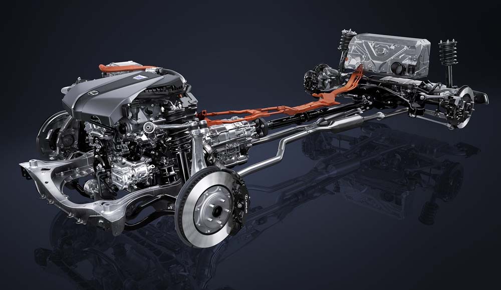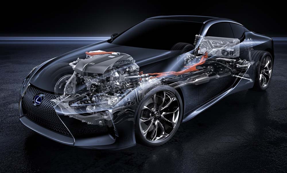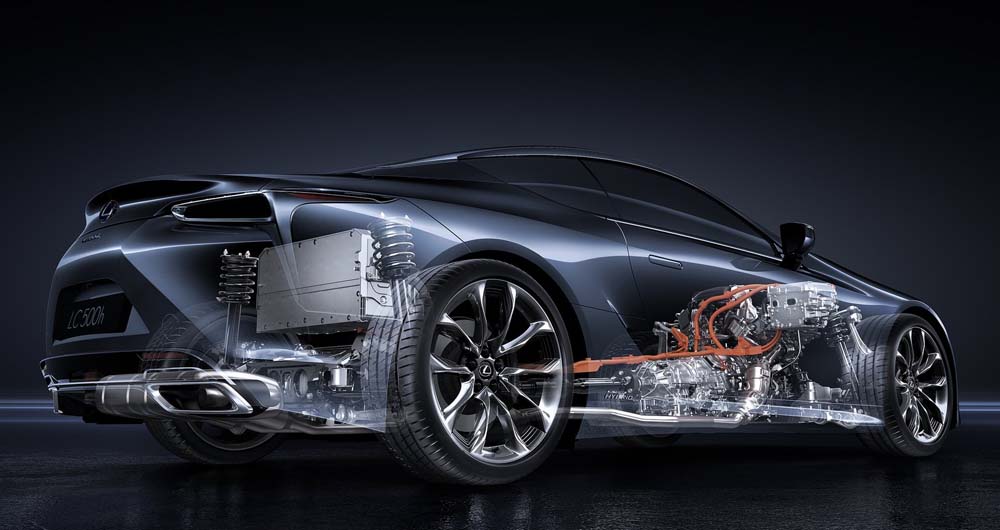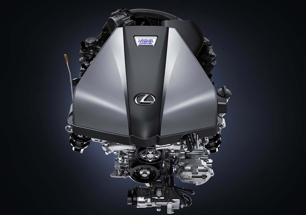 Έτσι, το υβριδικό LC 500h που θα κάνει πρεμιέρα στην Γενεύη συνδυάζει έναν V6 των 3.500 cc με έναν ηλεκτροκινητήρα και αποδίδει συνολικά 359 άλογα στις 6.600 σ.α.λ. και 348 Nm στις 4.900 σ.α.λ. To e-motor αποδίδει 60 άλογα, υπάρχουν μπαταρίες λιθίου-ιόντων (ζυγίζουν 50 κιλά και παρέχουν ισχύ 44,6 kW), ενώ ενδιαφέρον έχει η τετραβάθμια μετάδοση με χειροκίνητη επιλογή των σχέσεων με πρόγραμμα Eco (εκκινεί με τον ηλεκτροκινητήρα και 3η σχέση στο κιβώτιο για περίπου 1,6 km) ή Sport και Sport+ (όπου στην εκκίνηση επιλέγεται η κοντύτερη σχέση για μάξιμουμ επιτάχυνση).